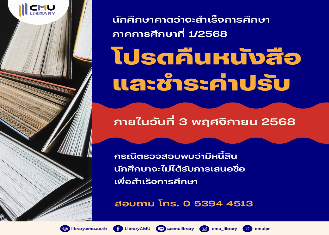 นักศึกษาคาดว่าจะสำเร็จการศึกษา ภาคการศึกษาที่ 1/2568 โปรดชำระหนี้สินและคืนหนังสือ ภายในวันจันทร์ที่ 3 พฤศจิกายน 2568
