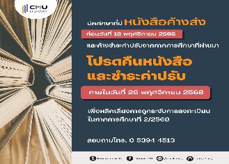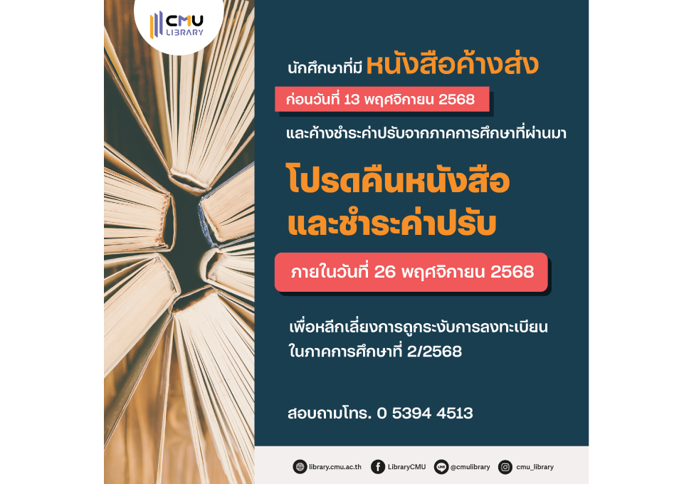 นักศึกษาคาดว่าจะสำเร็จการศึกษา ภาคการศึกษาที่ 1/2568 โปรดชำระหนี้สินและคืนหนังสือ ภายในวันจันทร์ที่ 3 พฤศจิกายน 2568