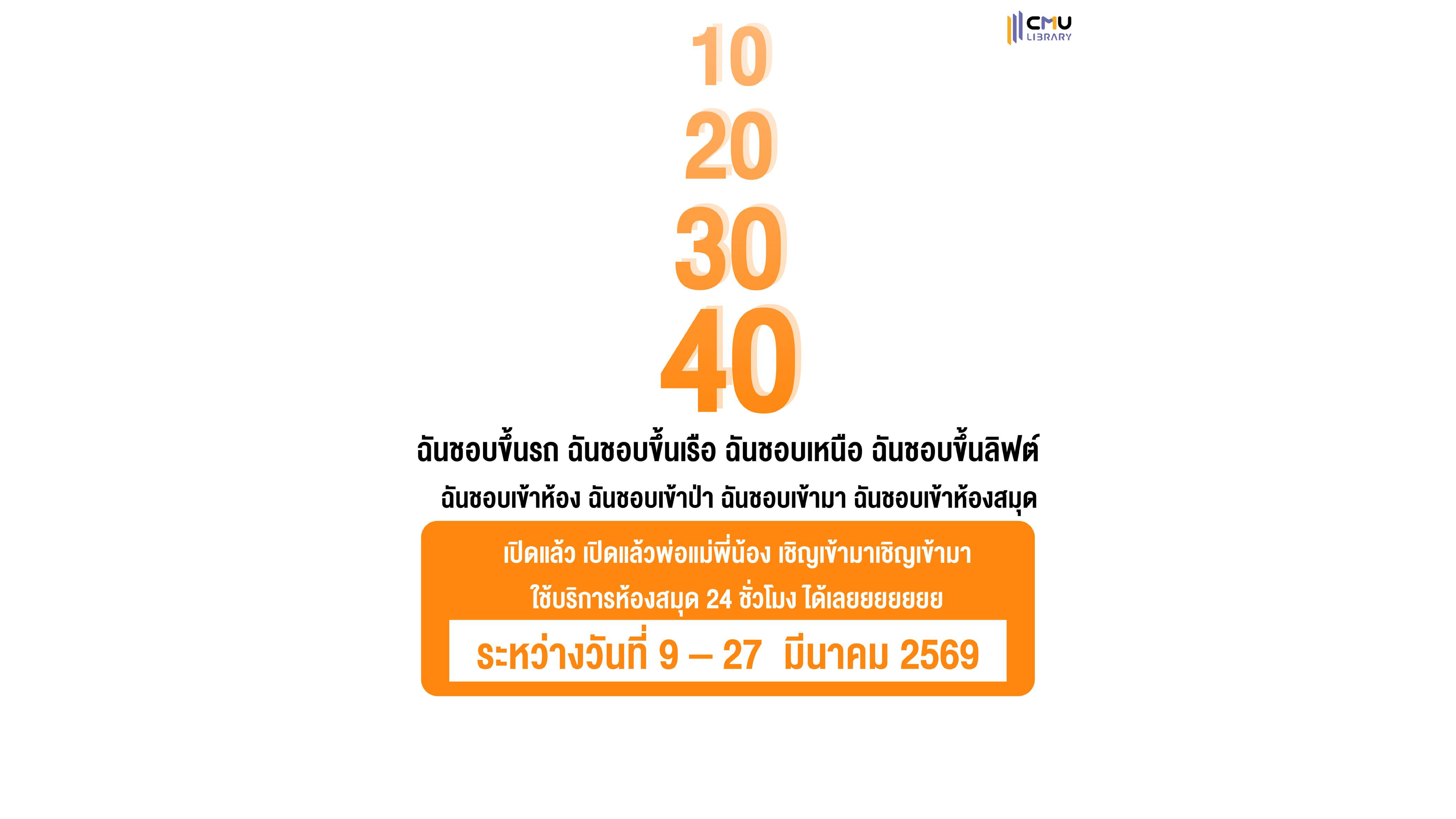 สำนักหอสมุดเปิดให้บริการพื้นที่นั่งอ่านหนังสือ 24 ชั่วโมง ระหว่างวันที่ 9 - 27 มีนาคม 2569