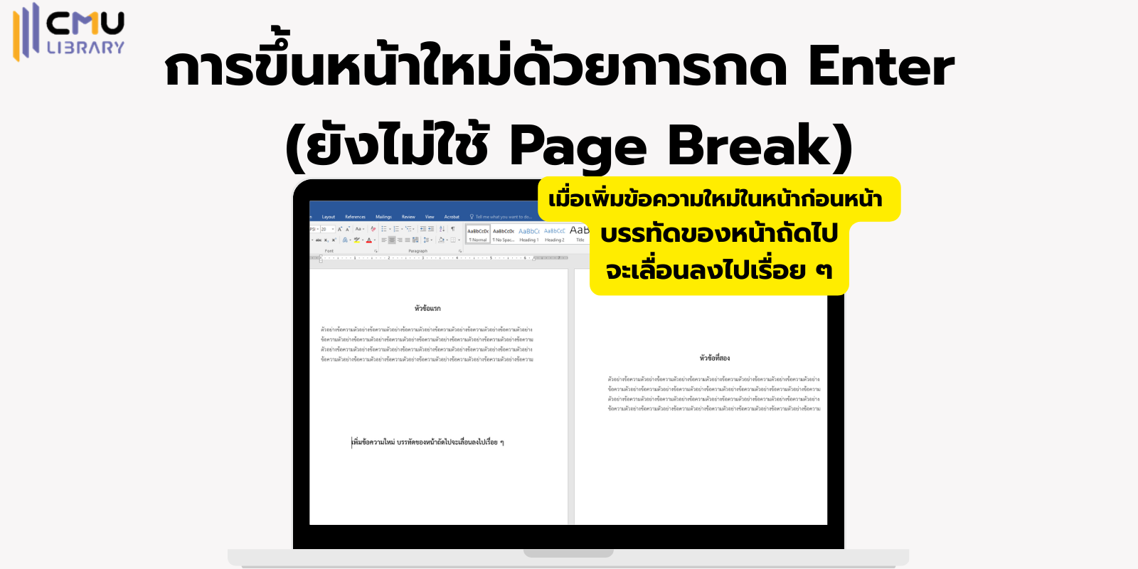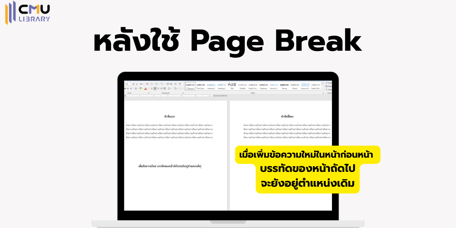 เทคนิการแบ่งหน้ากระดาษถัดไปใน Microsoft Word ด้วย Page Break หลายคนชินกับการกด Enter เพื่อขึ้นหน้าใหม่หรือแบ่งหน้ากระดาษ ปัญหาที่เกิดขึ้นคือ หากเพิ่มข้อความในหน้าก่อนหน้าในภายหลัง จะทำให้บรรทัดของข้อความหน้าถัดไปเลื่อนลงไปเรื่อย ๆ วันนี้จะมาแนะนำวิธีขึ้นหน้าใหม่โดยใช้ Page Break เป็นการแบ่งหน้ากระดาษ ทำให้ข้อความที่อยู่ในหน้าถัดไปอยู่ตำแหน่งเดิม ไม่เลื่อนแม้จะมีการเพิ่มข้อความในหน้าก่อนหน้า