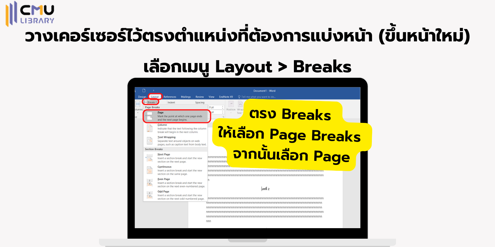 สามารถเปิดการใช้ Page Break โดยวางเคอร์เซอร์ไว้ตรงตำแหน่งที่ต้องการแบ่งหน้าหรือขึ้นหน้าใหม่ จากนั้นเลือกเมนู Layout > Breaks ให้ดูที่ส่วน Page Breaks จากนั้นเลือก Page