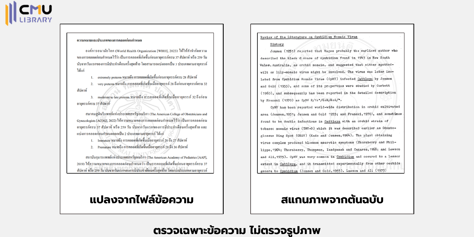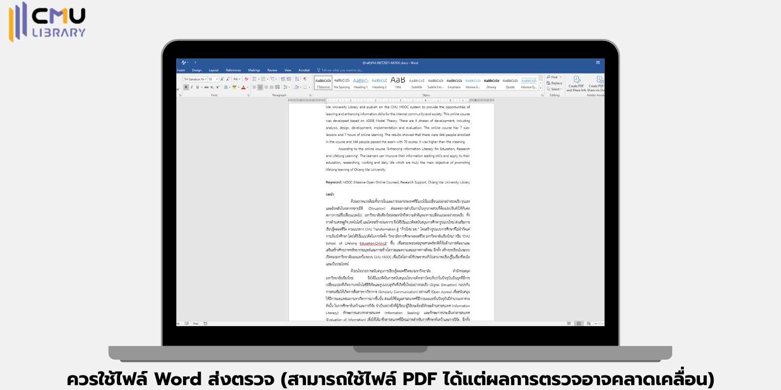 2. ควรใช้ไฟล์ Word ส่งตรวจ สำหรับการตรวจ Turnitin สามารถใช้ไฟล์ Word (.Docx) และ PDF ได้ แต่เพื่อให้ได้ผลการตรวจที่แม่นยำที่สุด แนะนำให้ใช้ไฟล์ Word (.Docx) หากใช้ไฟล์ PDF ส่งผลให้ผลการตรวจคลาดเคลื่อนได้