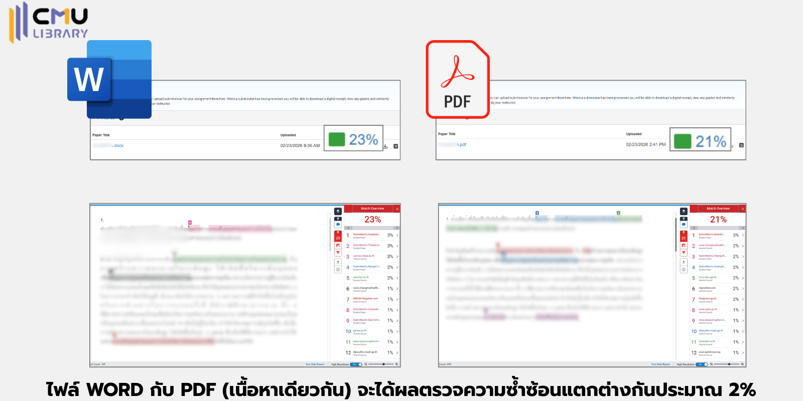 3. ไฟล์ WORD กับ PDF (เนื้อหาเดียวกัน) จะได้ผลตรวจความซ้ำซ้อนแตกต่างกันประมาณ 2% จากข้อ 2 หากทดลองนำไฟล์ที่มีเนื้อหาเดียวกันแต่คนละนามสกุล ส่งเข้าระบบตรวจเปรียบเทียบ จะได้ผลลัพธ์ที่แตกต่างกันประมาณ 2% ดังนั้นเพื่อให้ได้ผลการตรวจที่ถูกต้อง แนะนำให้ใช้ไฟล์ Word (.Docx)