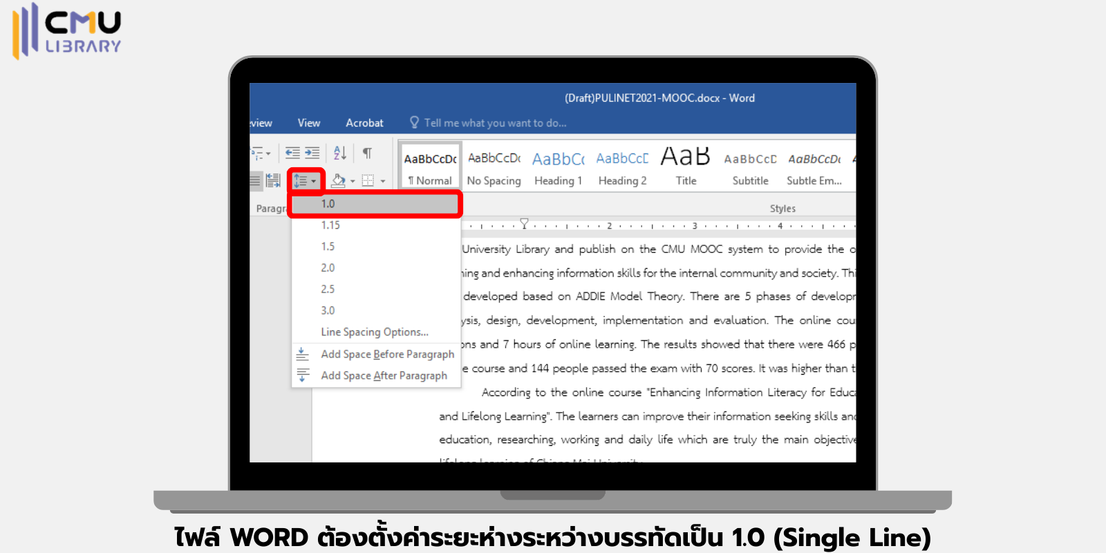 4. ไฟล์ WORD ต้องตั้งค่าระยะห่างระหว่างบรรทัดเป็น 1.0 (Single Line) ก่อนส่งไฟล์เข้าตรวจในระบบ จะต้องตั้งค่าระยะห่างระหว่างบรรทัดก่อน โดยเลือกเนื้อหาทั้งหมด และตั้งค่าเป็น 1.0 ตามภาพ หากไม่ตั้งค่า ระบบจะไม่สามารถแสดงผลการตรวจได้ กรณีที่ต้องตั้งค่าระยะห่างในต้นฉบับมากกว่า 1.0 เช่น ไฟล์ที่เว้นระยะบรรทัดเผื่อแก้ไข ให้บันทึกไฟล์ใหม่ ตั้งค่าเป็น 1.0 (คงเนื้อหาเดิมไว้ให้เหมือนไฟล์ต้นฉบับ) และส่งตรวจในระบบ