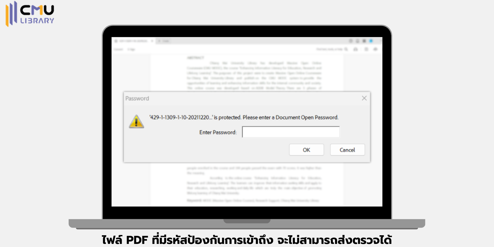 5. ไฟล์ PDF ที่มีรหัสป้องกันการเข้าถึง จะไม่สามารถส่งตรวจได้ Turnitin จะเข้าถึงไฟล์ที่ตั้งค่าการเข้าถึงปกติ ไม่มีรหัสผ่านเท่านั้น กรณีที่มีรหัสผ่าน ระบบจะเข้าถึงเนื้อหาภายในเอกสารไม่ได้ หากต้องการส่งไฟล์ตรวจ จะต้องตั้งค่ารหัสผ่านเป็น No Password ก่อน