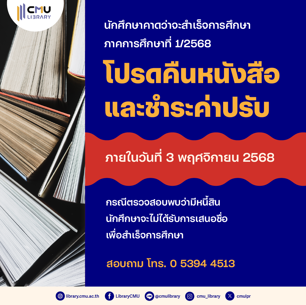 นักศึกษาคาดว่าจะสำเร็จการศึกษา ภาคการศึกษาที่ 1/2568 โปรดชำระหนี้สินและคืนหนังสือ ภายในวันจันทร์ที่ 3 พฤศจิกายน 2568 กรณีตรวจสอบพบว่ามีหนี้สินนักศึกษาจะไม่ได้รับการเสนอชื่อเพื่อสำเร็จการศึกษา สอบถามเพิ่มเติม โทร. 053-944513