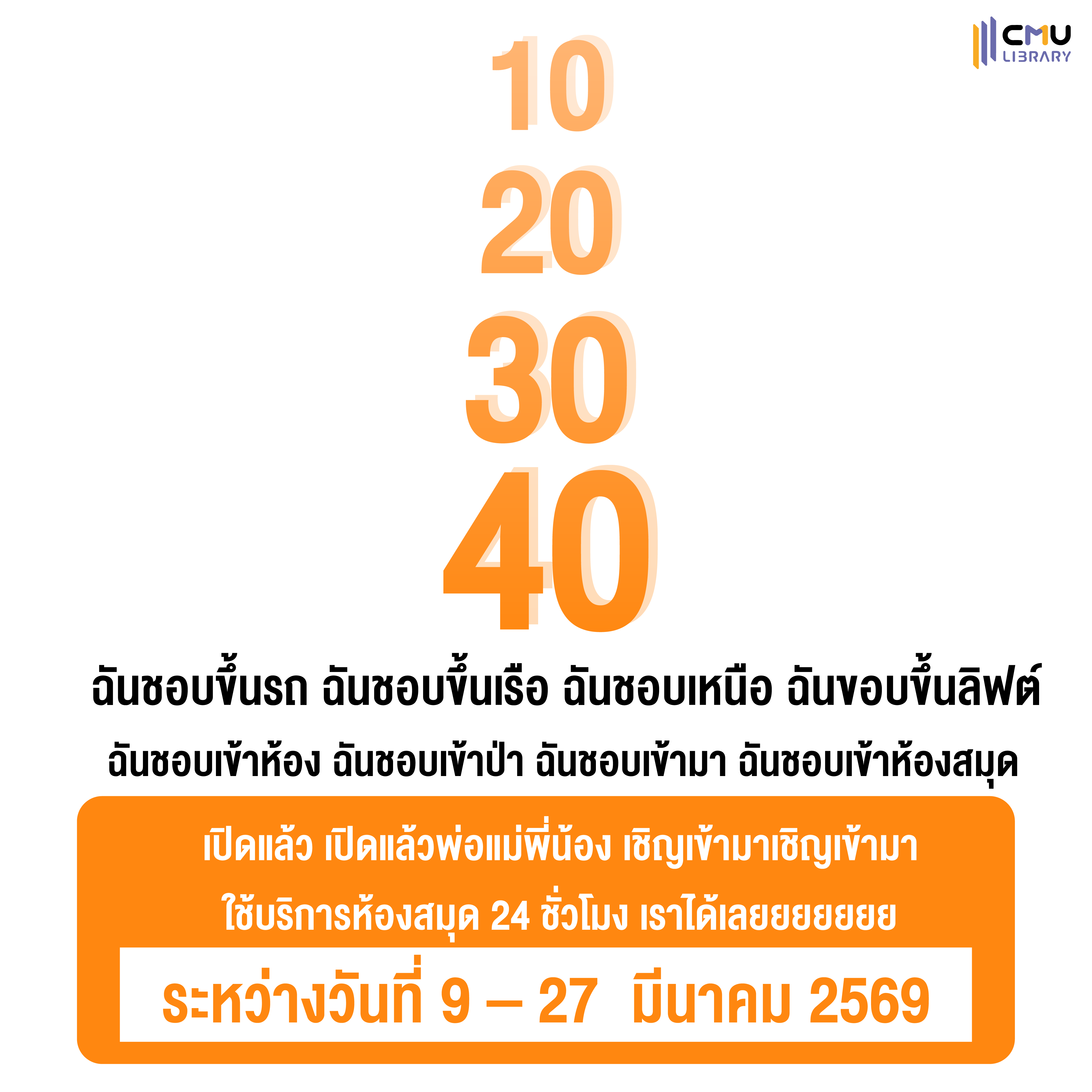 สำนักหอสมุดเปิดให้บริการพื้นที่นั่งอ่านหนังสือ 24 ชั่วโมง ระหว่างวันที่ 9 - 27 มีนาคม 2569