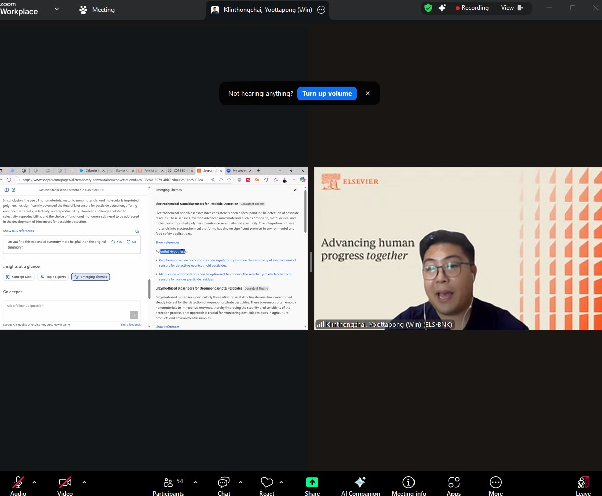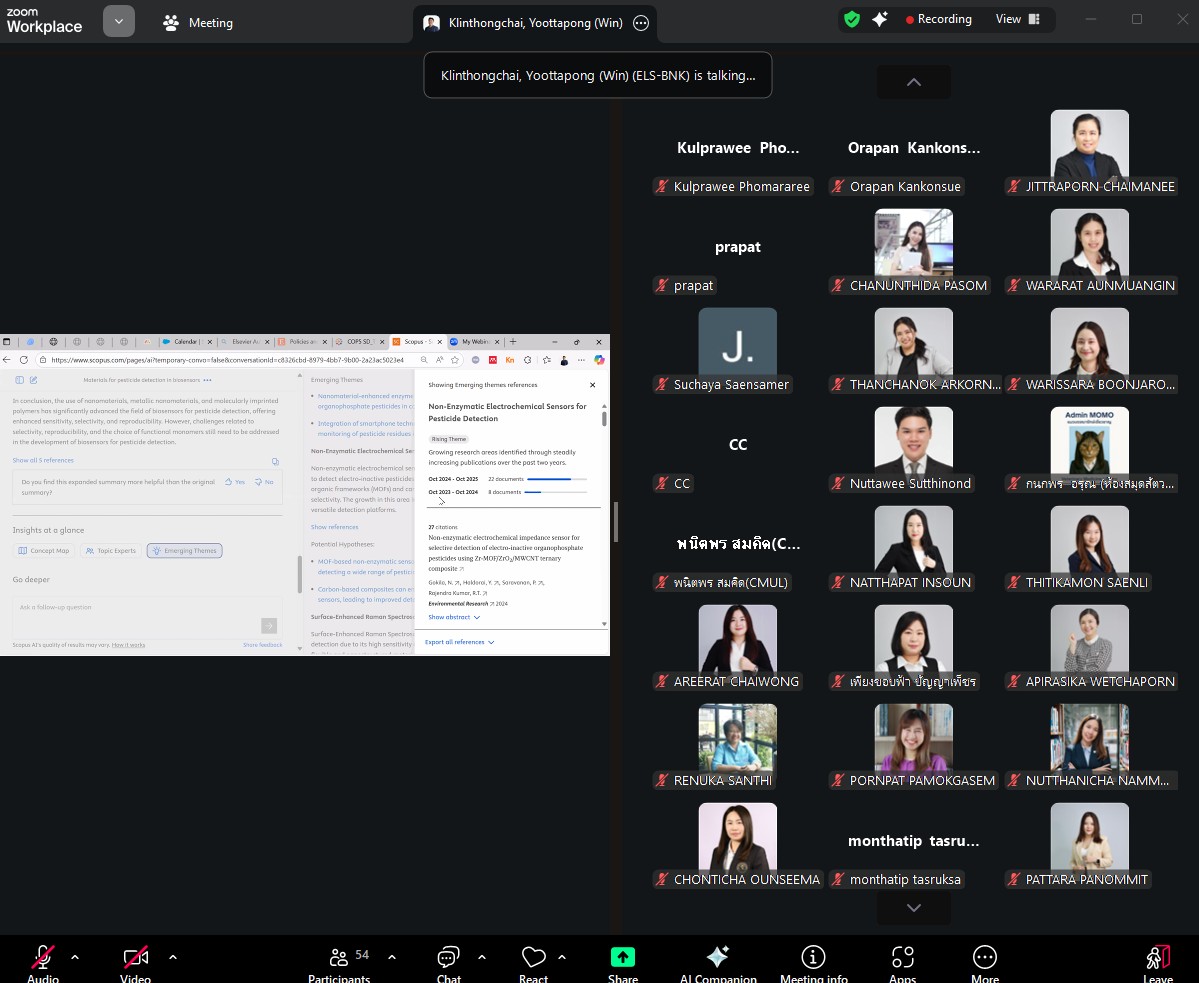 ฝ่ายบริการและส่งเสริมการเรียนรู้ งานส่งเสริมการเรียนรู้ สำนักหอสมุด จัดการอบรมเกี่ยวกับการใช้งาน Scopus AI โดยมี ดร.ยุทธพงศ์ กลิ่นธงชัย Customer Success Manager, Elsevier เป็นวิทยากร เพื่อให้บุคลากรสำนักหอสมุดได้ศึกษาเรียนรู้คุณสมบัติและวิธีการใช้งานเครื่องมือของ Scopus AI ในการสนับสนุนผู้ใช้บริการและนักวิจัยของมหาวิทยาลัย ผ่านโปรแกรมออนไลน์ Zoom เมื่อวันที่ 6 ตุลาคม พ.ศ. 2568