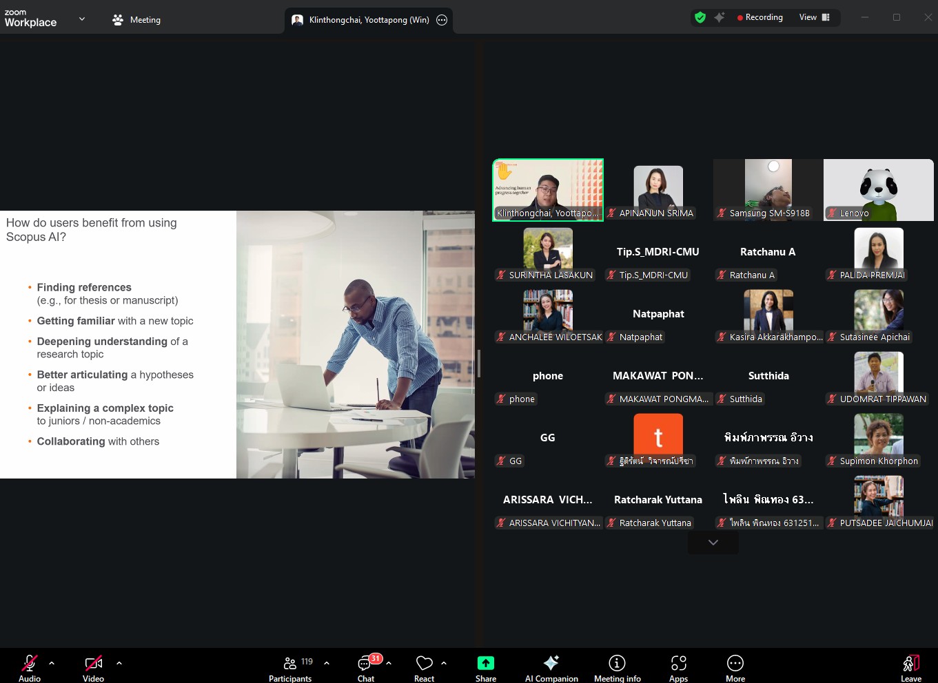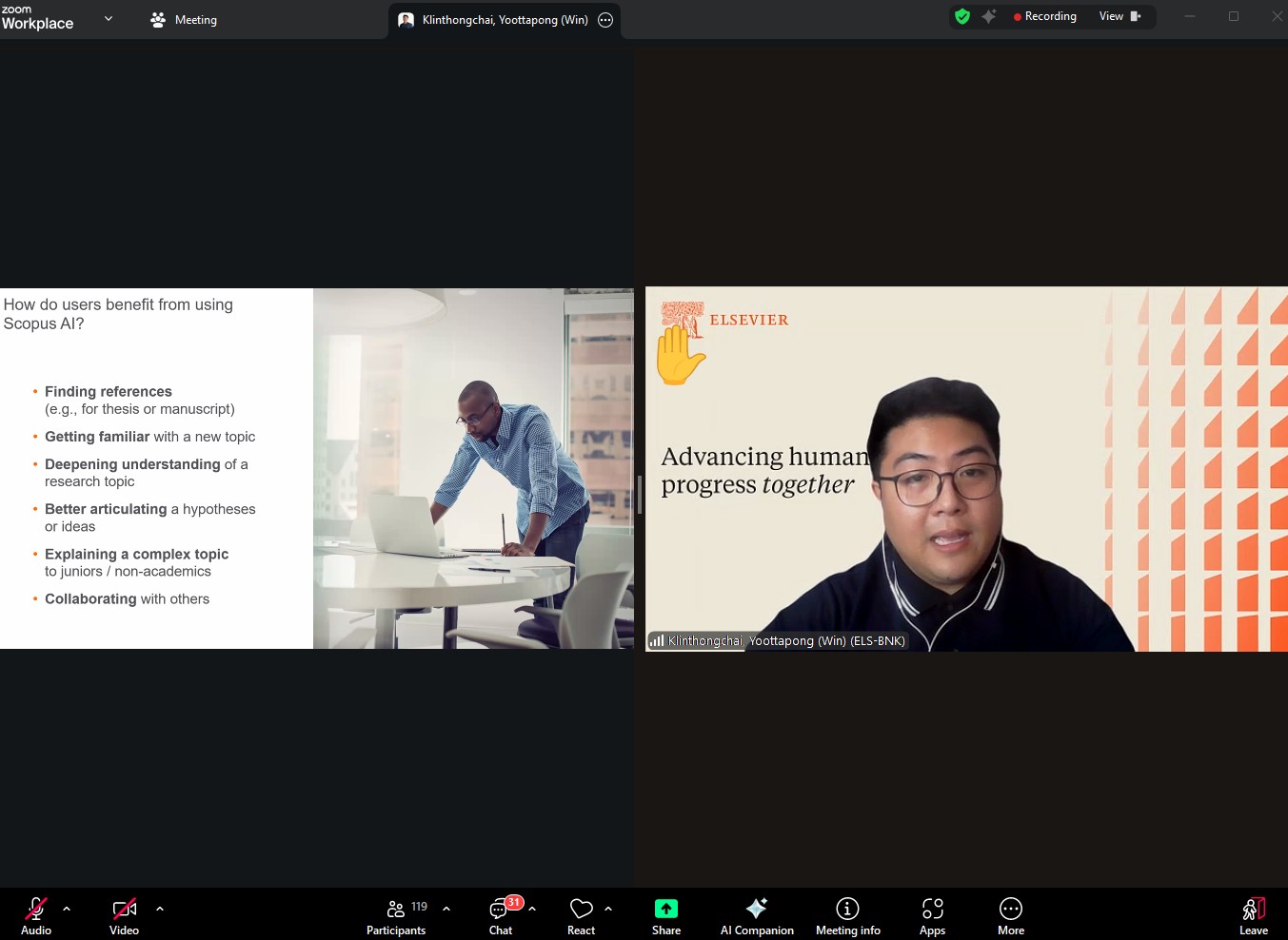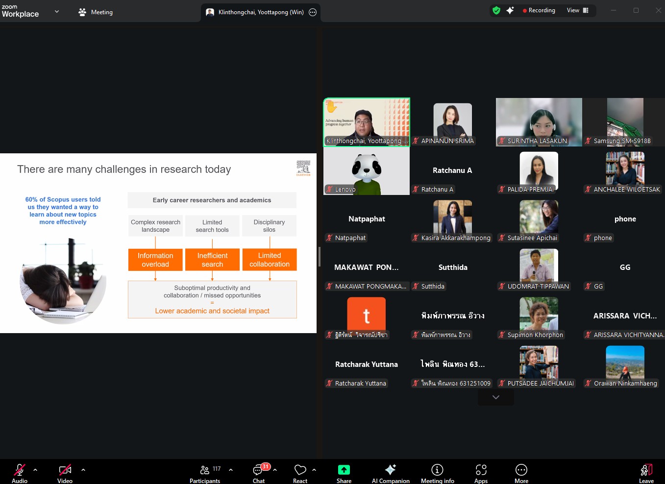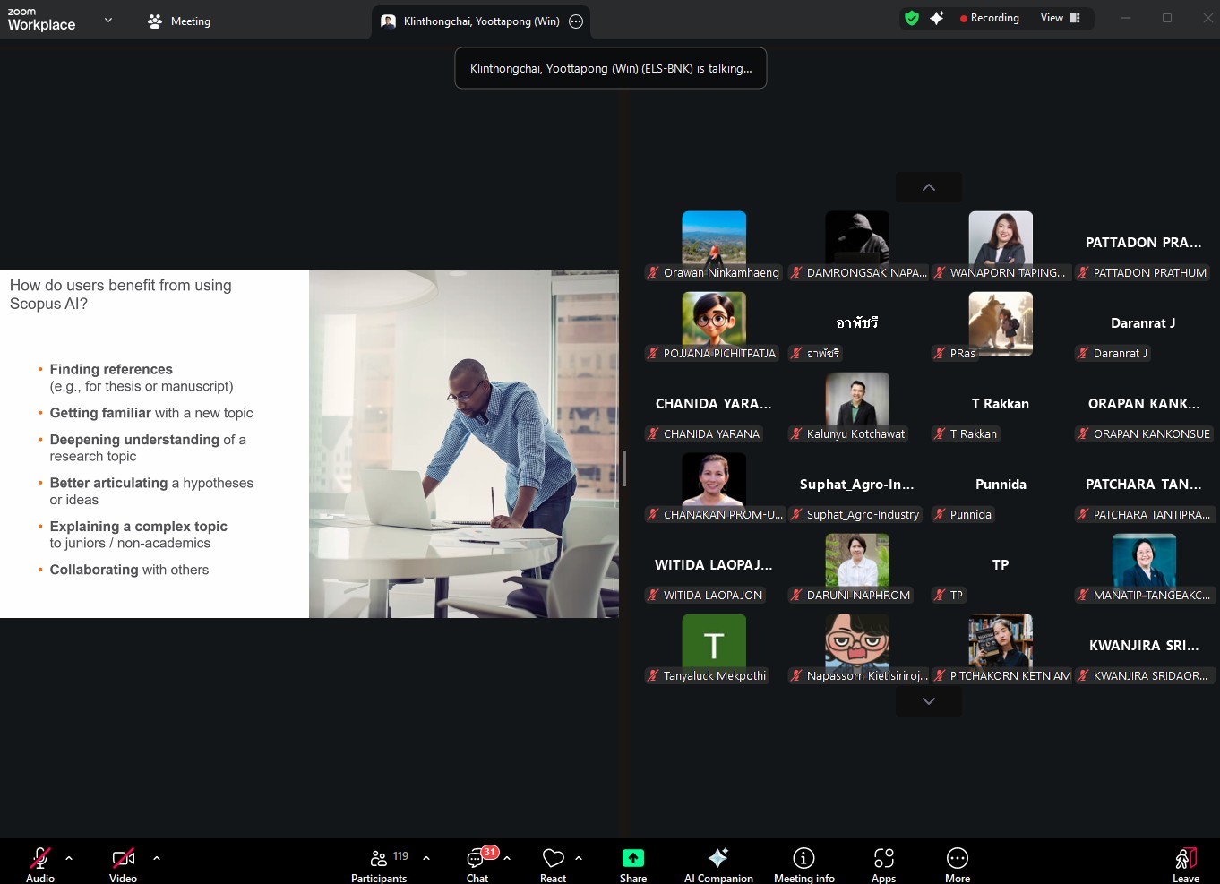 สำนักหอสมุด โดยฝ่ายบริการและส่งเสริมการเรียนรู้ งานส่งเสริมการเรียนรู้ จัดการอบรมเกี่ยวกับการใช้งาน Scopus AI โดยมี ดร.ยุทธพงศ์ กลิ่นธงชัย Customer Success Manager, Elsevier เป็นวิทยากร เพื่อแนะนำการใช้งานฐานข้อมูล Scopus AI สำหรับการทำวิจัยเบื้องต้น ให้ผู้ใช้บริการสามารถค้นคว้าได้อย่างมีประสิทธิภาพ ผ่านโปรแกรมออนไลน์ Zoom เมื่อวันที่ 10 ตุลาคม พ.ศ. 2568