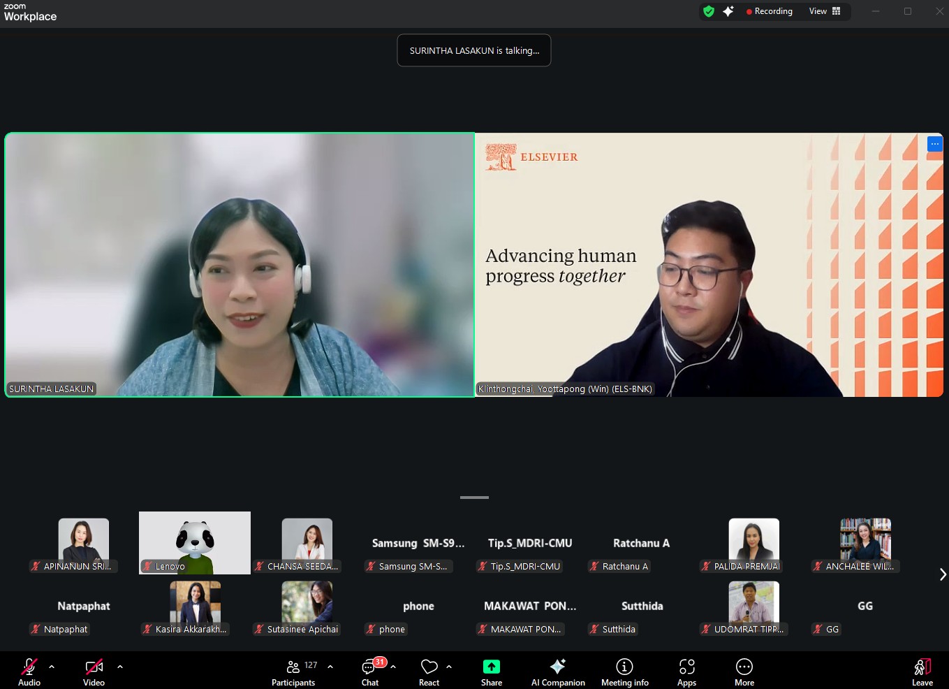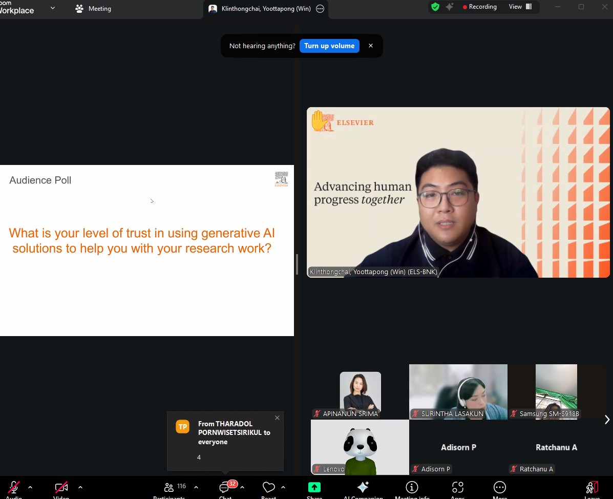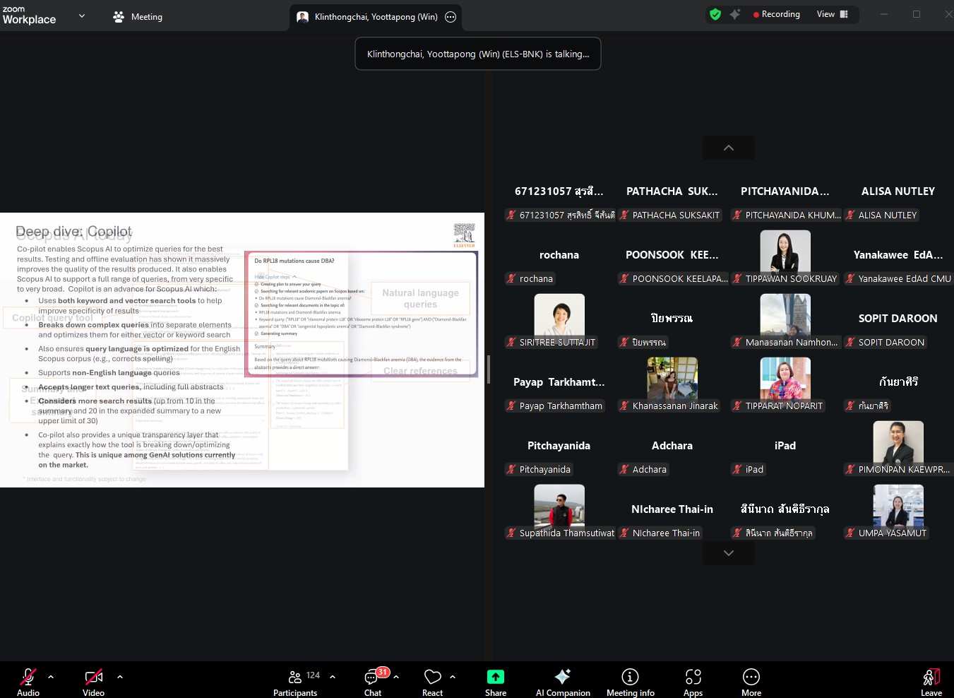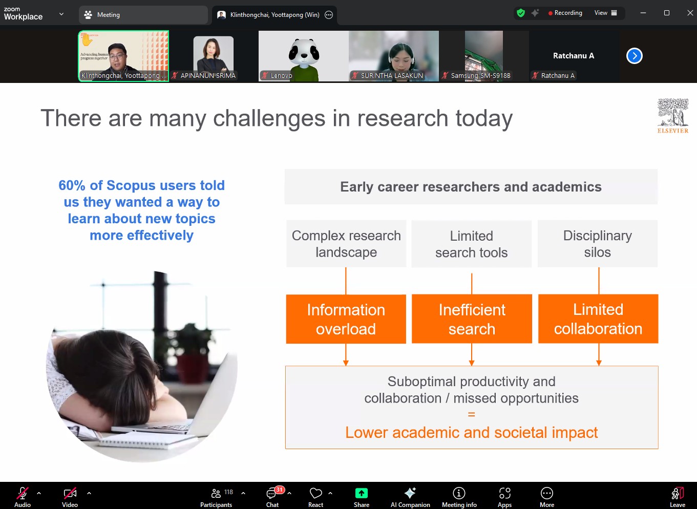 สำนักหอสมุด โดยฝ่ายบริการและส่งเสริมการเรียนรู้ งานส่งเสริมการเรียนรู้ จัดการอบรมเกี่ยวกับการใช้งาน Scopus AI โดยมี ดร.ยุทธพงศ์ กลิ่นธงชัย Customer Success Manager, Elsevier เป็นวิทยากร เพื่อแนะนำการใช้งานฐานข้อมูล Scopus AI สำหรับการทำวิจัยเบื้องต้น ให้ผู้ใช้บริการสามารถค้นคว้าได้อย่างมีประสิทธิภาพ ผ่านโปรแกรมออนไลน์ Zoom เมื่อวันที่ 10 ตุลาคม พ.ศ. 2568