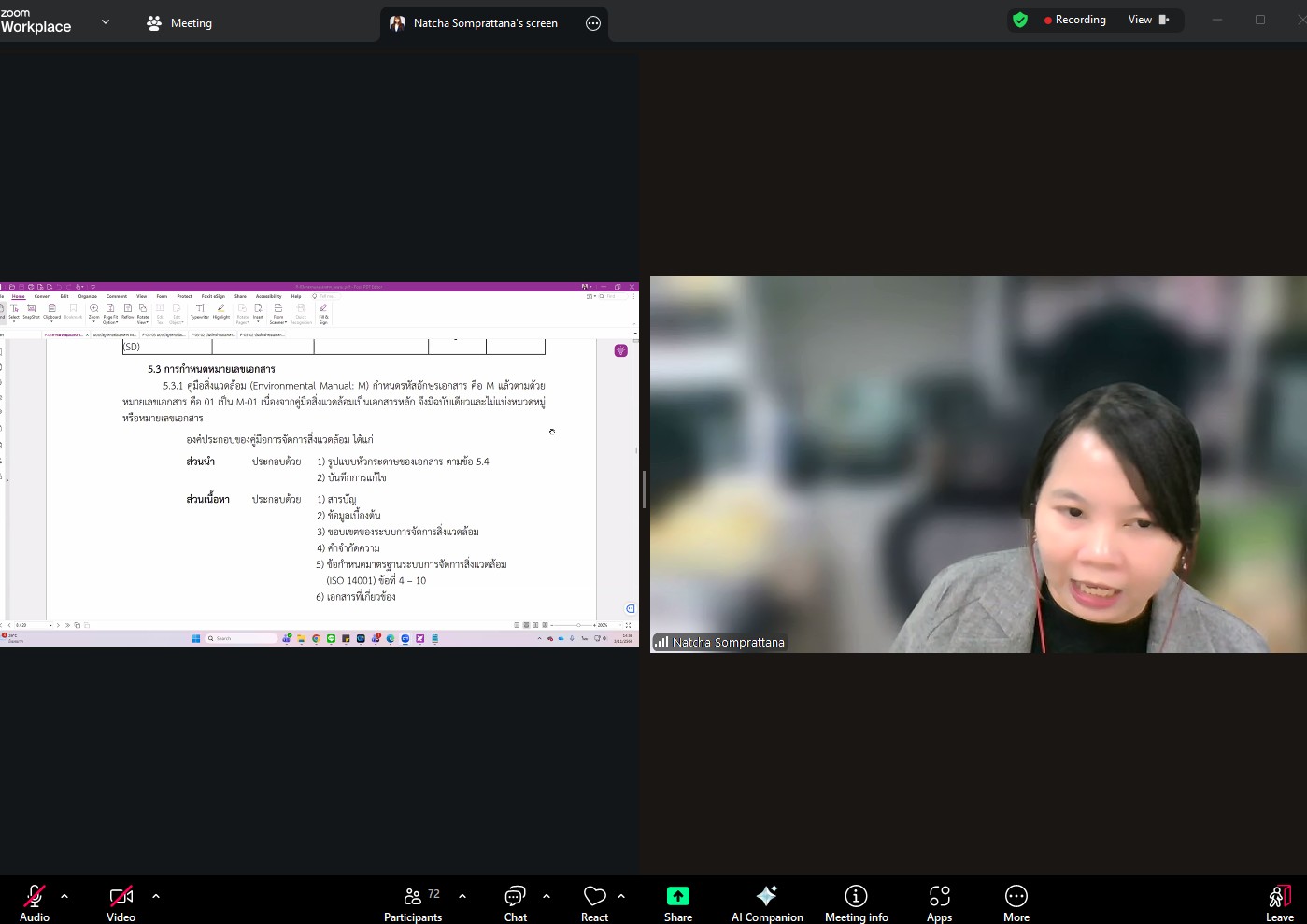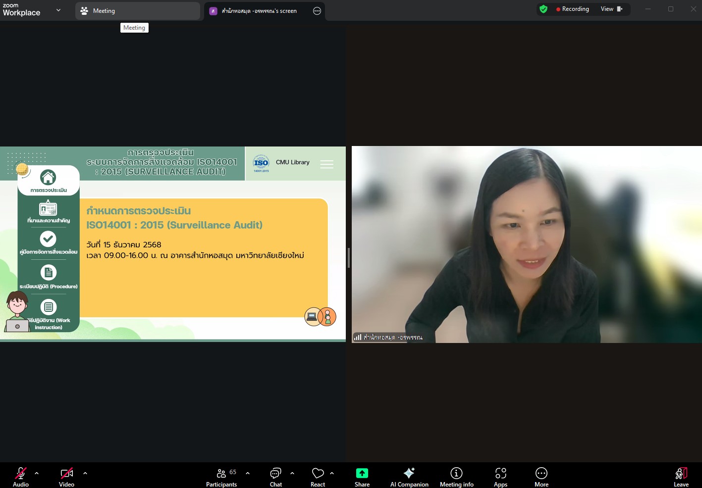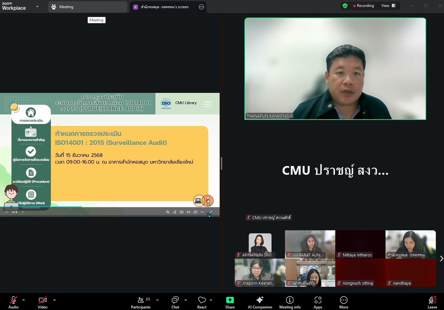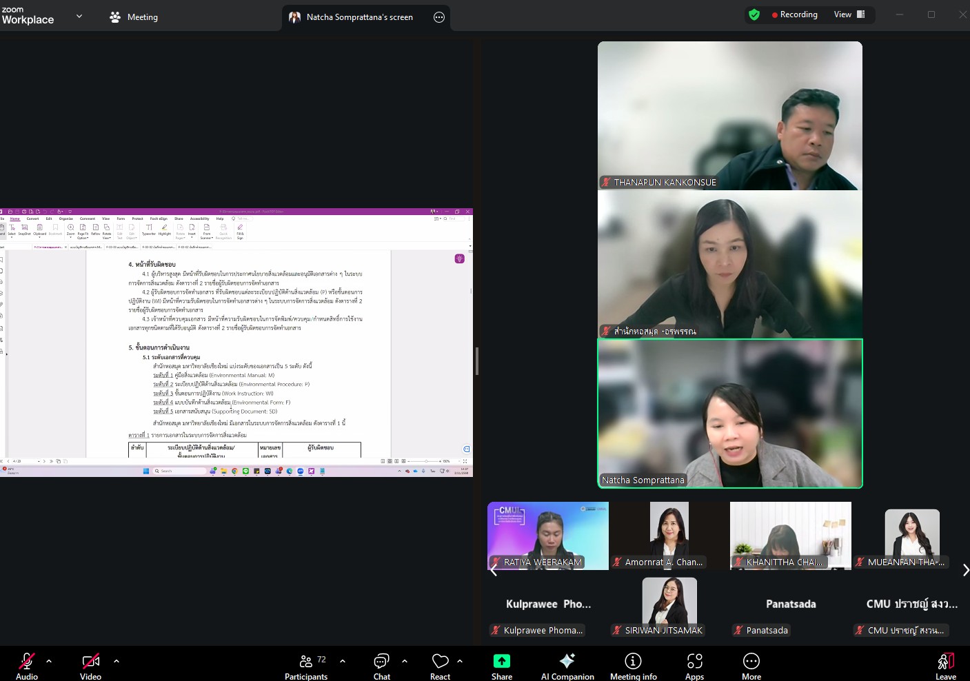 สำหรับการ Surveillance Audit ระบบมาตรฐานการจัดการสิ่งแวดล้อม ISO 14001 : 2015 ได้แก่ ประเด็นสำคัญในการเตรียมความพร้อม Surveillance Audit มาตรการด้านสิ่งแวดล้อมที่ปรับปรุงใหม่ และการดำเนินการของแต่ละ P / WI ในปี พ.ศ. 2568 ผ่านโปรแกรมออนไลน์ Zoom เมื่อวันที่ 3 พฤศจิกายน พ.ศ. 2568