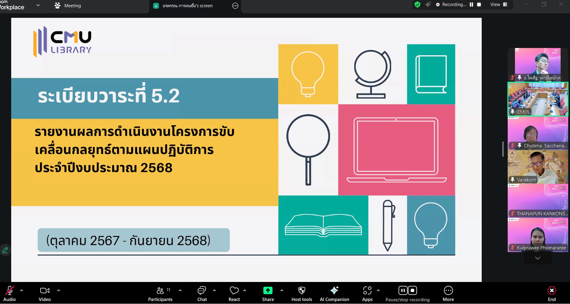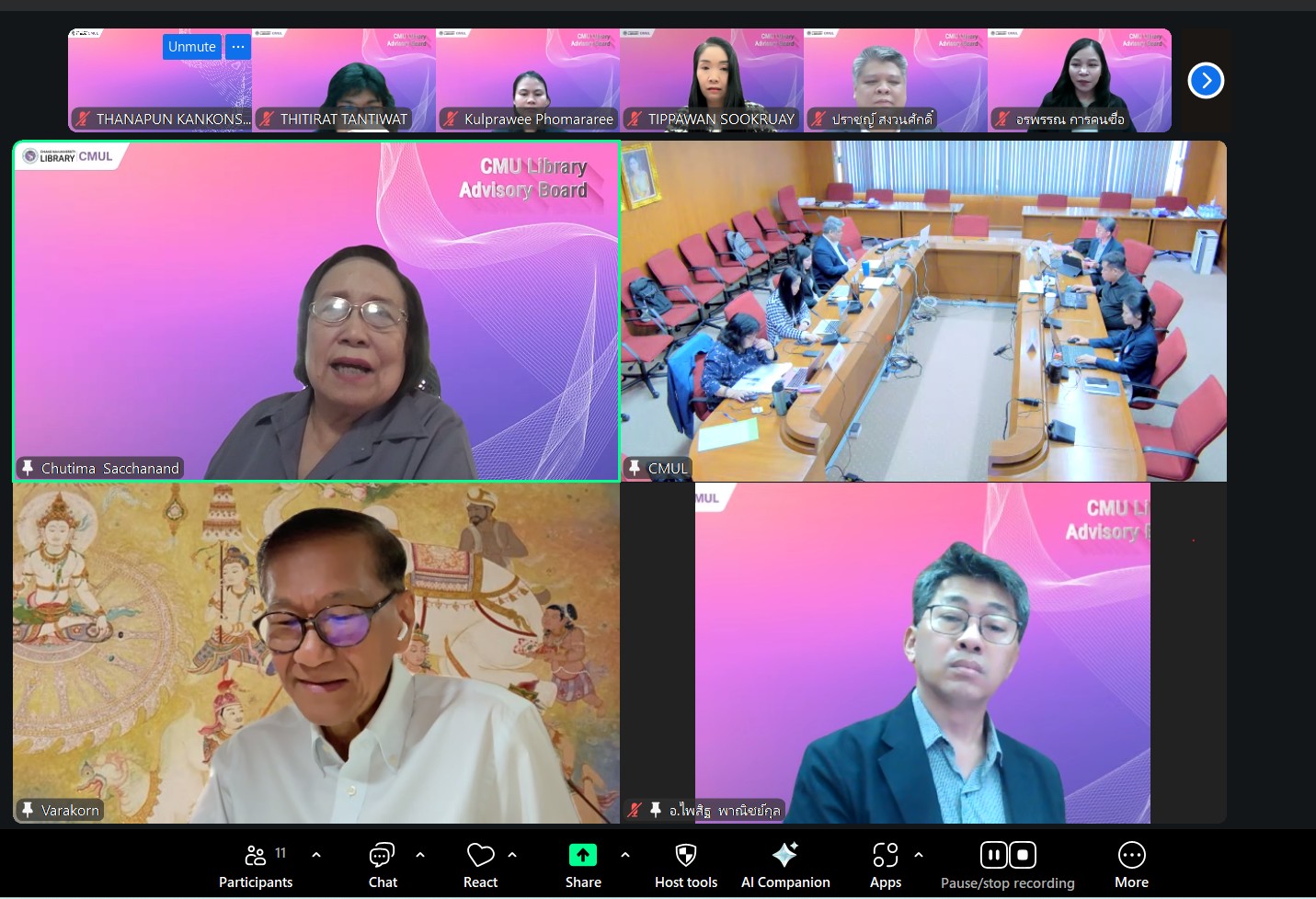 สำนักหอสมุดจัดการประชุมคณะกรรมการอำนวยการประจำสำนักหอสมุด ครั้งที่ 4/2568 โดยมี รองศาสตราจารย์ ดร.วรากรณ์ สามโกเศศ เป็นประธานคณะกรรมการ กรรมการประกอบด้วย ศาสตราจารย์เกียรติคุณ ดร.ชุติมา สัจจานันท์ รองศาสตราจารย์ ดร.รัฐสิทธิ์ สุขะหุต อาจารย์ ไพสิฐ พาณิชย์กุล และนายปราชญ์ สงวนศักดิ์ ผู้อำนวยการสำนักหอสมุด เป็นกรรมการและเลขานุการ พร้อมด้วยคณะผู้บริหารสำนักหอสมุด เข้าร่วมประชุม เพื่อพิจารณารายงานผลการดำเนินงานตามคำรับรองการปฏิบัติงานของส่วนงาน (CMU PA) และรายงานผลการดำเนินงานโครงการขับเคลื่อนกลยุทธ์ตามแผนปฏิบัติการ ประจำปีงบประมาณ 2568 (เดือนตุลาคม 2567 - เดือนกันยายน 2568) ณ ห้องประชุม 3 ชั้น 5 สำนักหอสมุด และผ่านโปรแกรมออนไลน์ Zoom เมื่อวันที่ 18 ธันวาคม พ.ศ. 2568