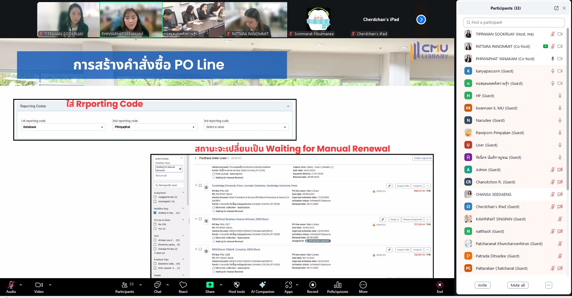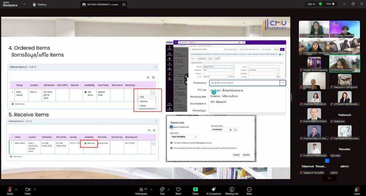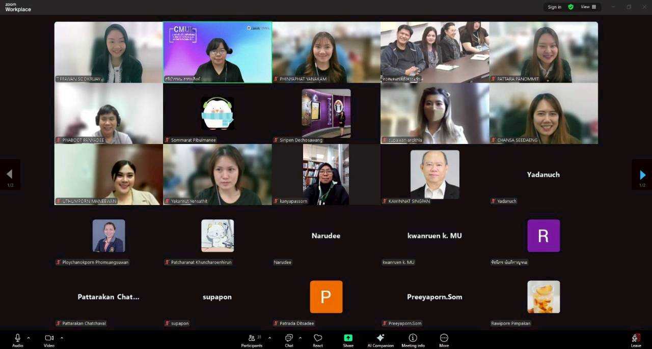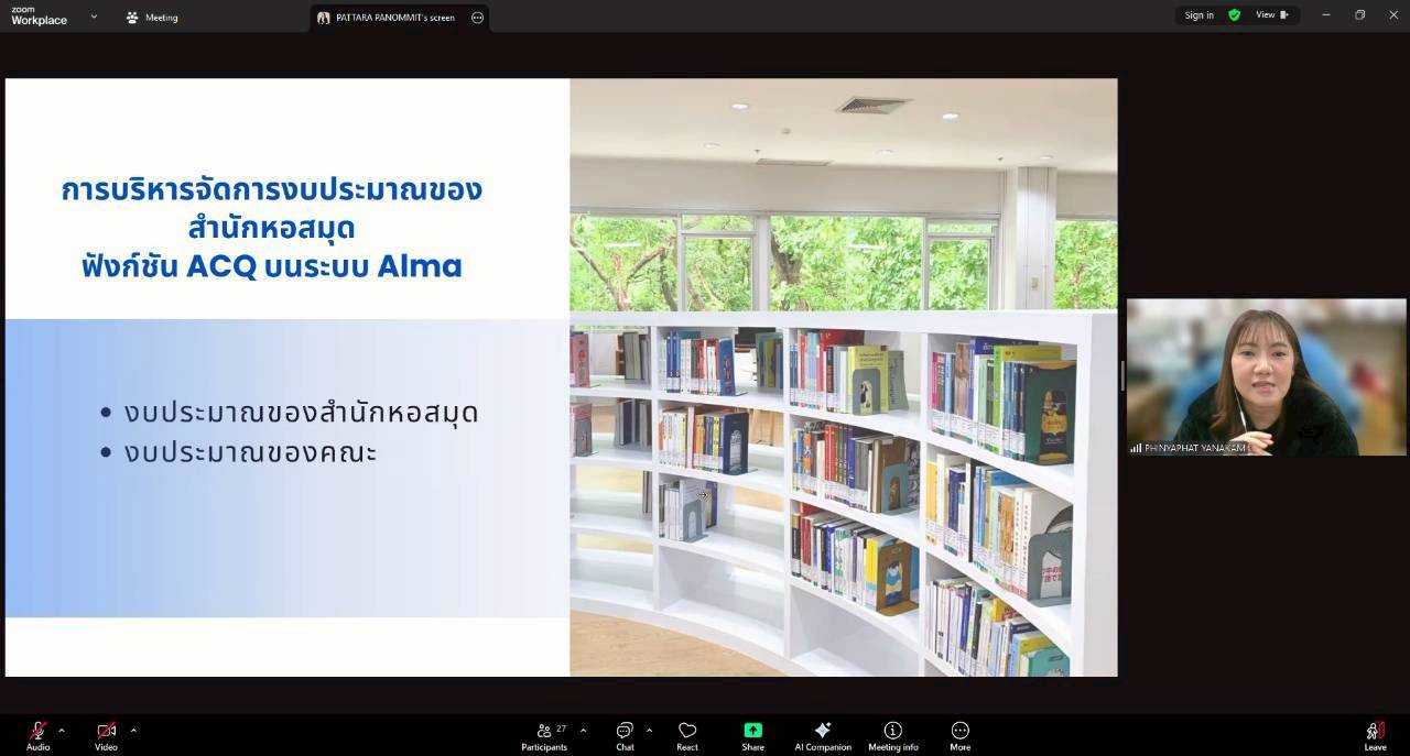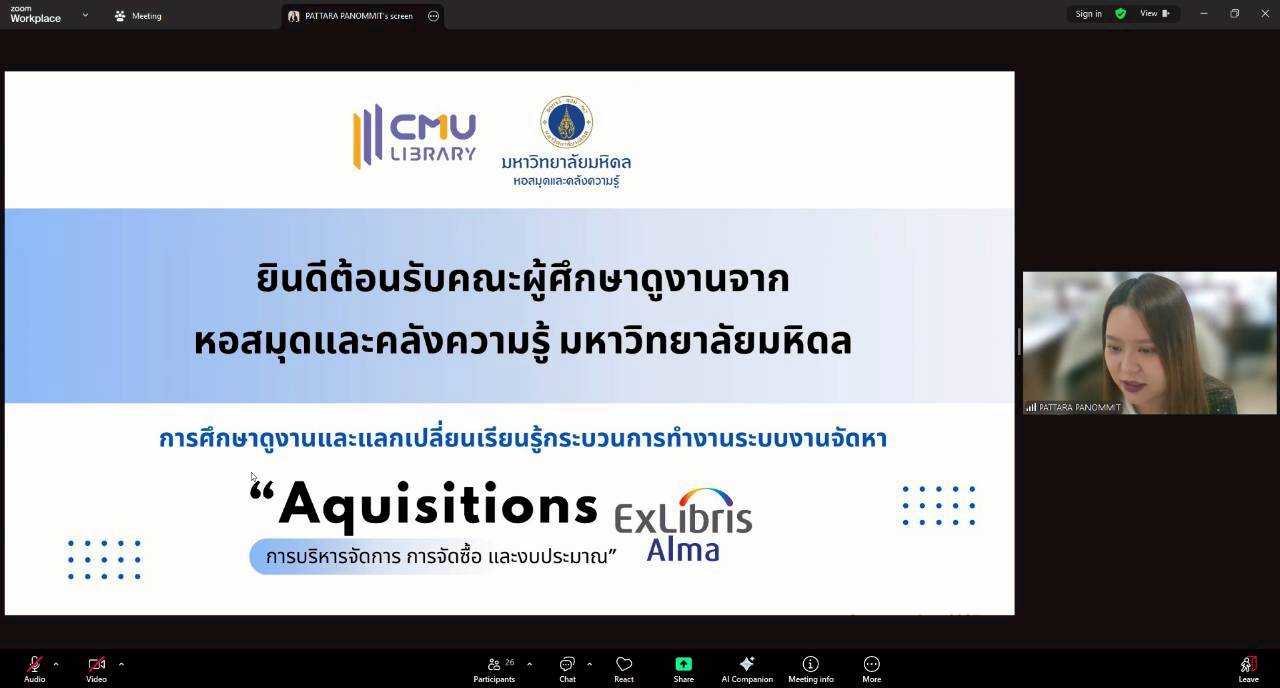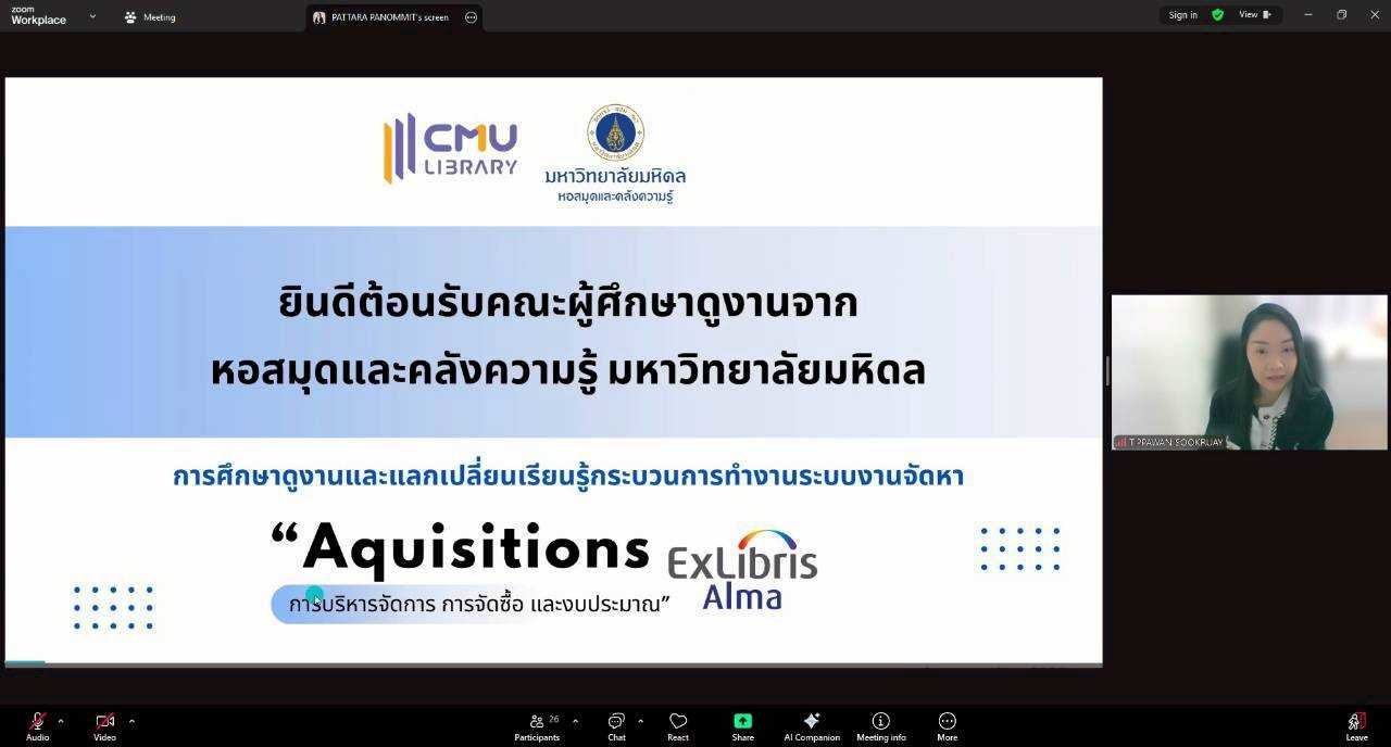นางทิพวรรณ สุขรวย รองผู้อำนวยการสำนักหอสมุด พร้อมบุคลากรสำนักหอสมุด ให้การต้อนรับพร้อมให้การบรรยายบุคลากรหอสมุดและคลังความรู้มหาวิทยาลัยมหิดล และผู้แทนบุคลากร จากห้องสมุดคณะ สถานบัน วิทยาลัย ในสังกัดมหาวิทยาลัยมหิดล ในการเข้าศึกษาดูงานและเข้าแลกเปลี่ยนเรียนรู้กระบวนการทำงานระบบงานจัดหา (Acquistion) และการบริหารงบประมาณในระบบจัดหา (Budget Management) ระบบห้องสมุดอัตโนมัต Alma โดยมี นางสาวภิญญาพัชญ์ ญานะคำ และนางสาวพัฑรา พนมมิตร ให้การบรรยาย หัวข้อ "ฟังก์ชัน ACQ" และนางสาวศุภวรรณ อาจกล้า ให้การบรรยาย หัวข้อ "ฟังก์ชัน Analytic" ผ่านโปรแกรมออนไลน์ Zoom เมื่อวันที่ 24 ธันวาคม พ.ศ. 2568