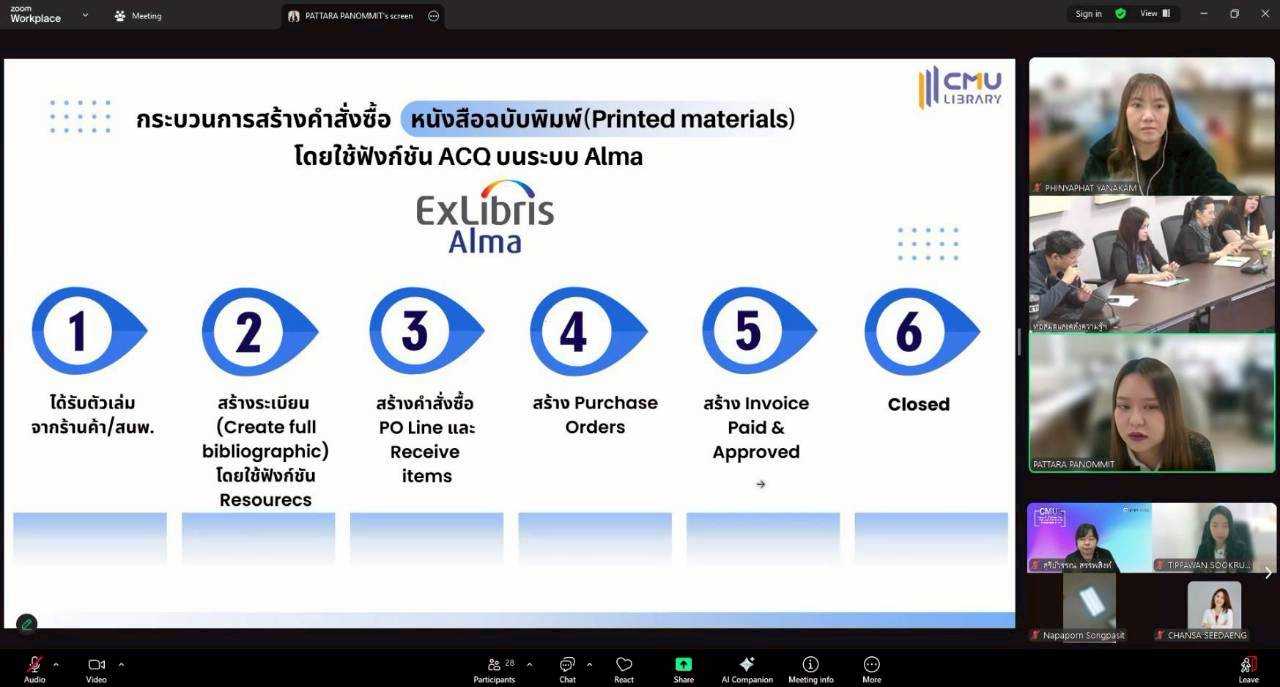 สำนักหอสมุดให้การต้อนรับบุคลากรหอสมุดและคลังความรู้มหาวิทยาลัยมหิดล ในการเข้าศึกษาดูงานและเข้าแลกเปลี่ยนเรียนรู้กระบวนการทำงานระบบงานจัดหา (Acquistion) ระบบห้องสมุดอัตโนมัต Alma