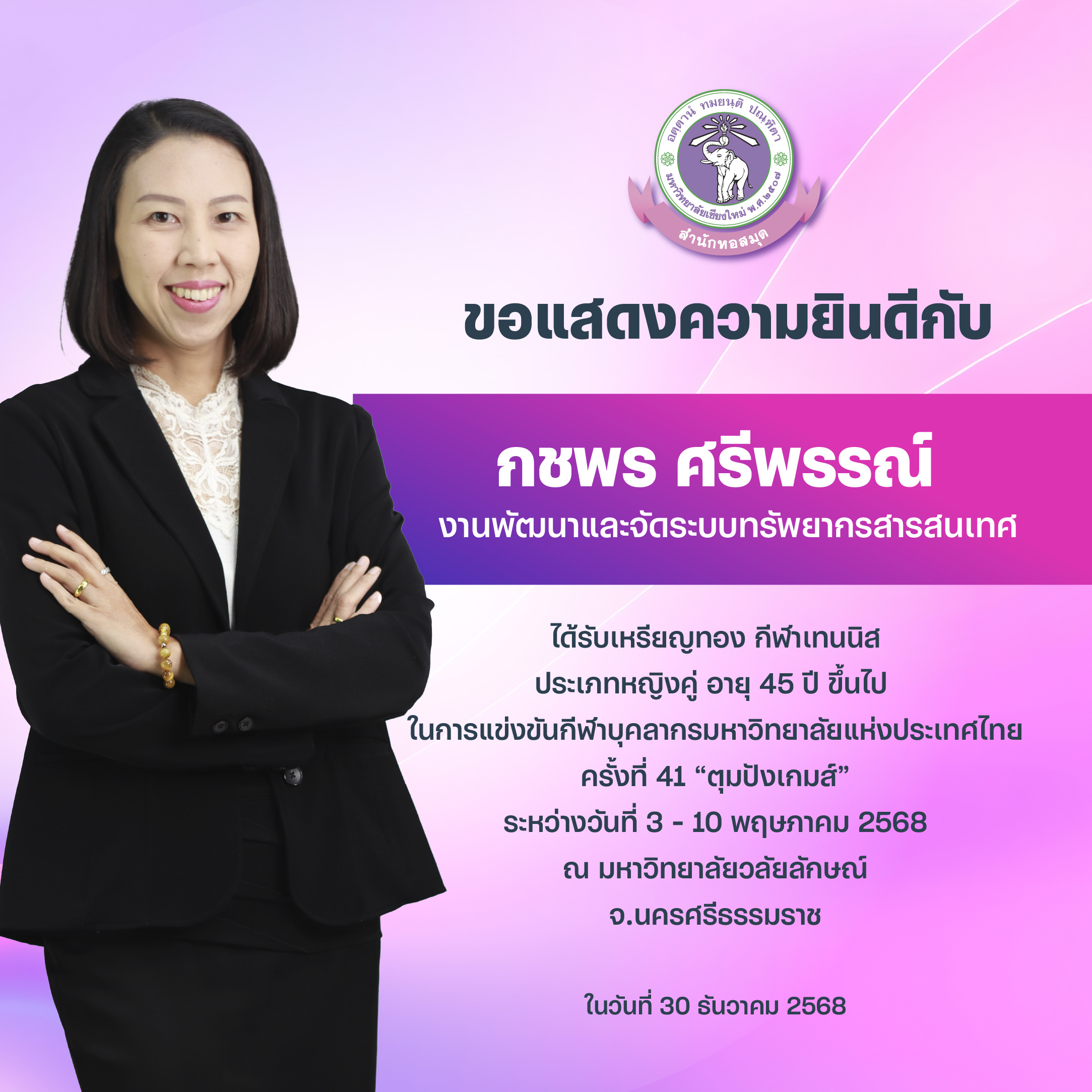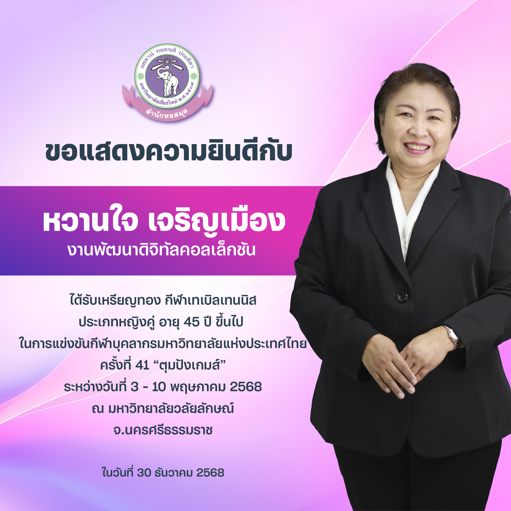 ได้รับเหรียญทอง กีฬาเทเบิลเทนนิส ประเภททีมหญิง ในการแข่งขันกีฬาบุคลากรมหาวิทยาลัยแห่งประเทศไทย ครั้งที่ 41 “ตุมปังเกมส์” ระหว่างวันที่ 3-10 พฤษภาคม 2568 ณ มหาวิทยาลัยวลัยลักษณ์ จ.นครศรีธรรมราช