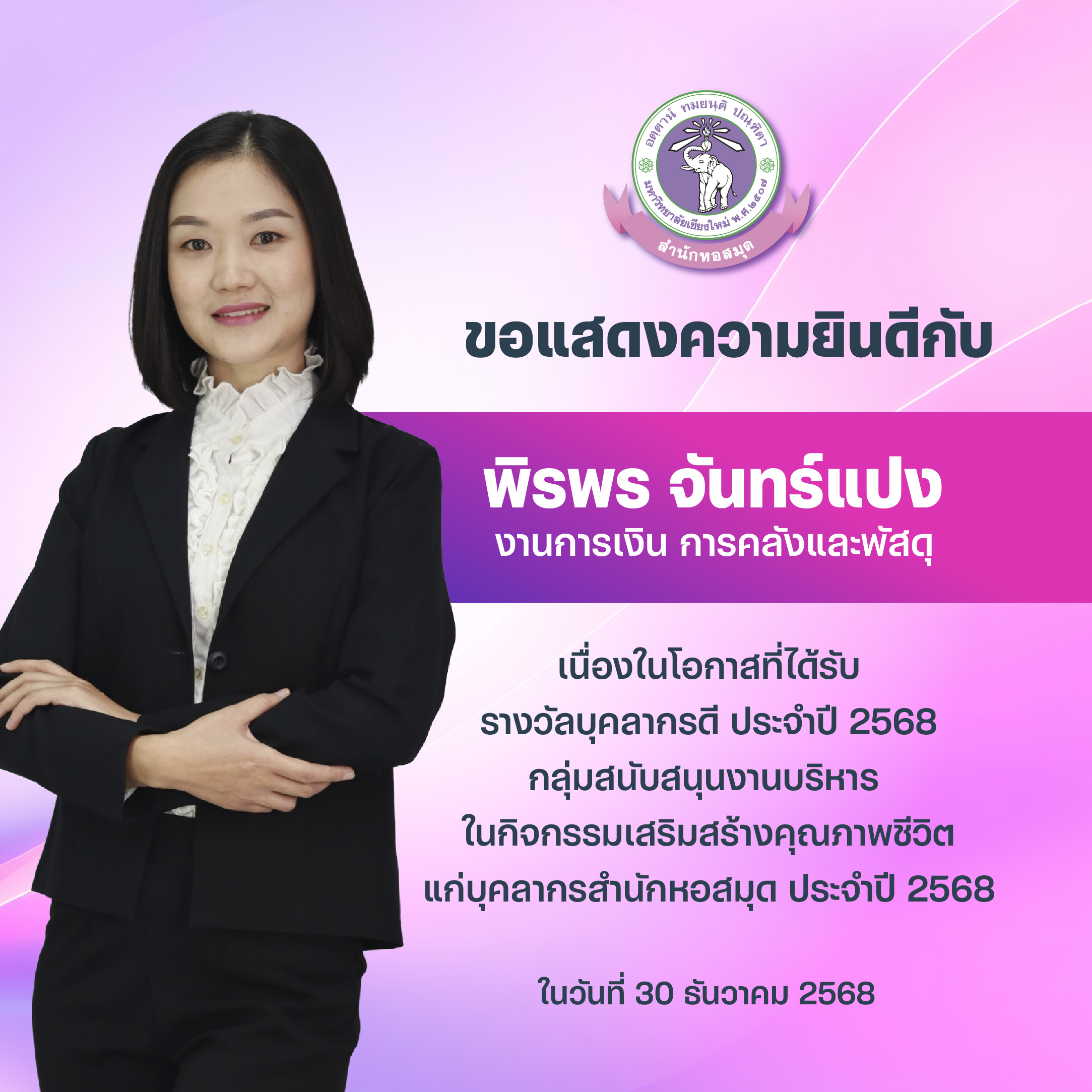 - นางสาวพิรพร จันทร์แปง กลุ่มสนับสนุนงานบริหาร