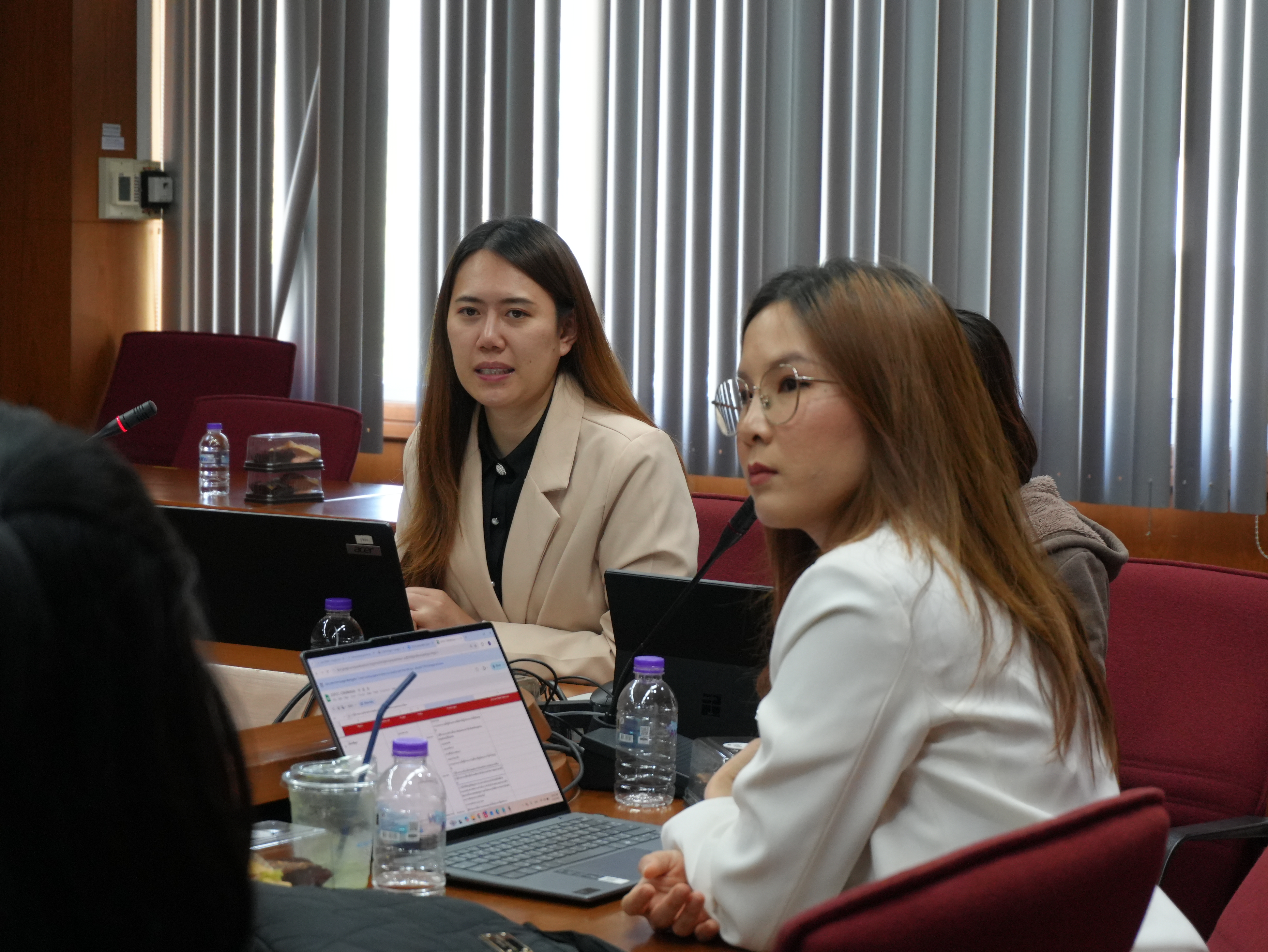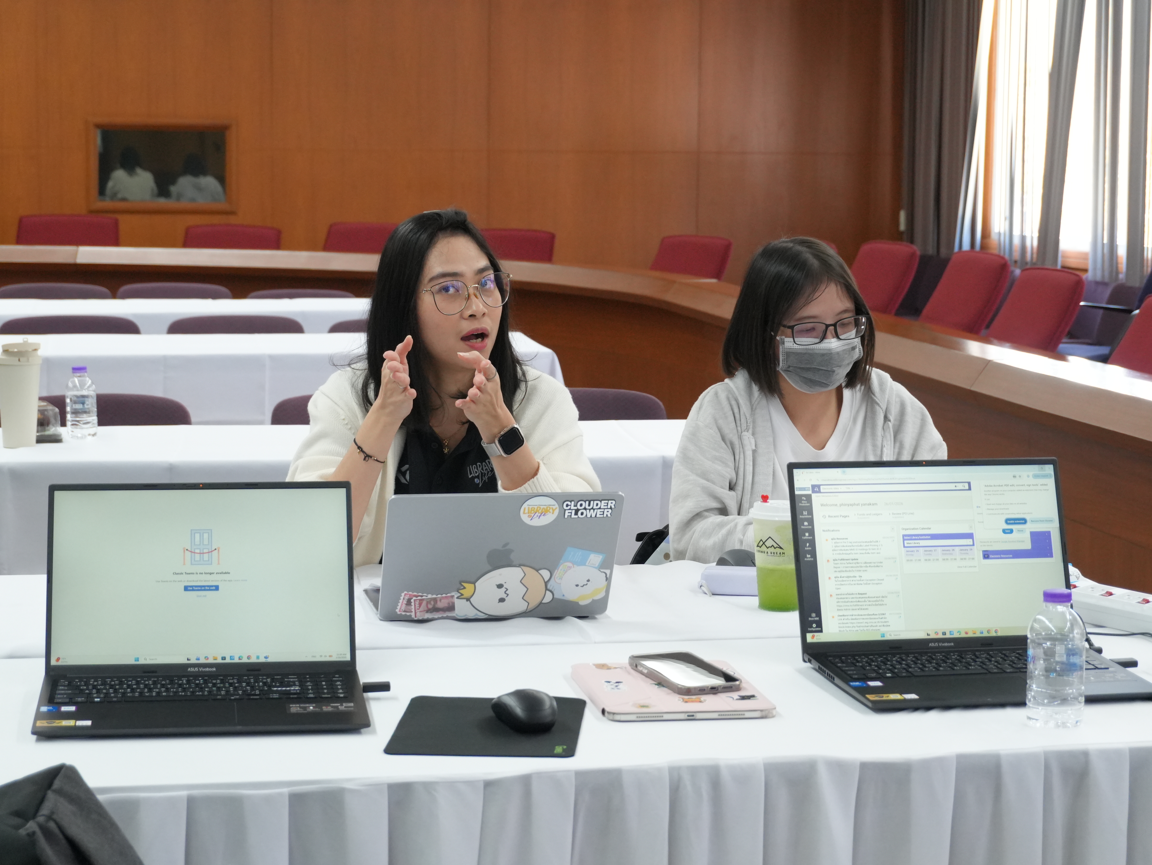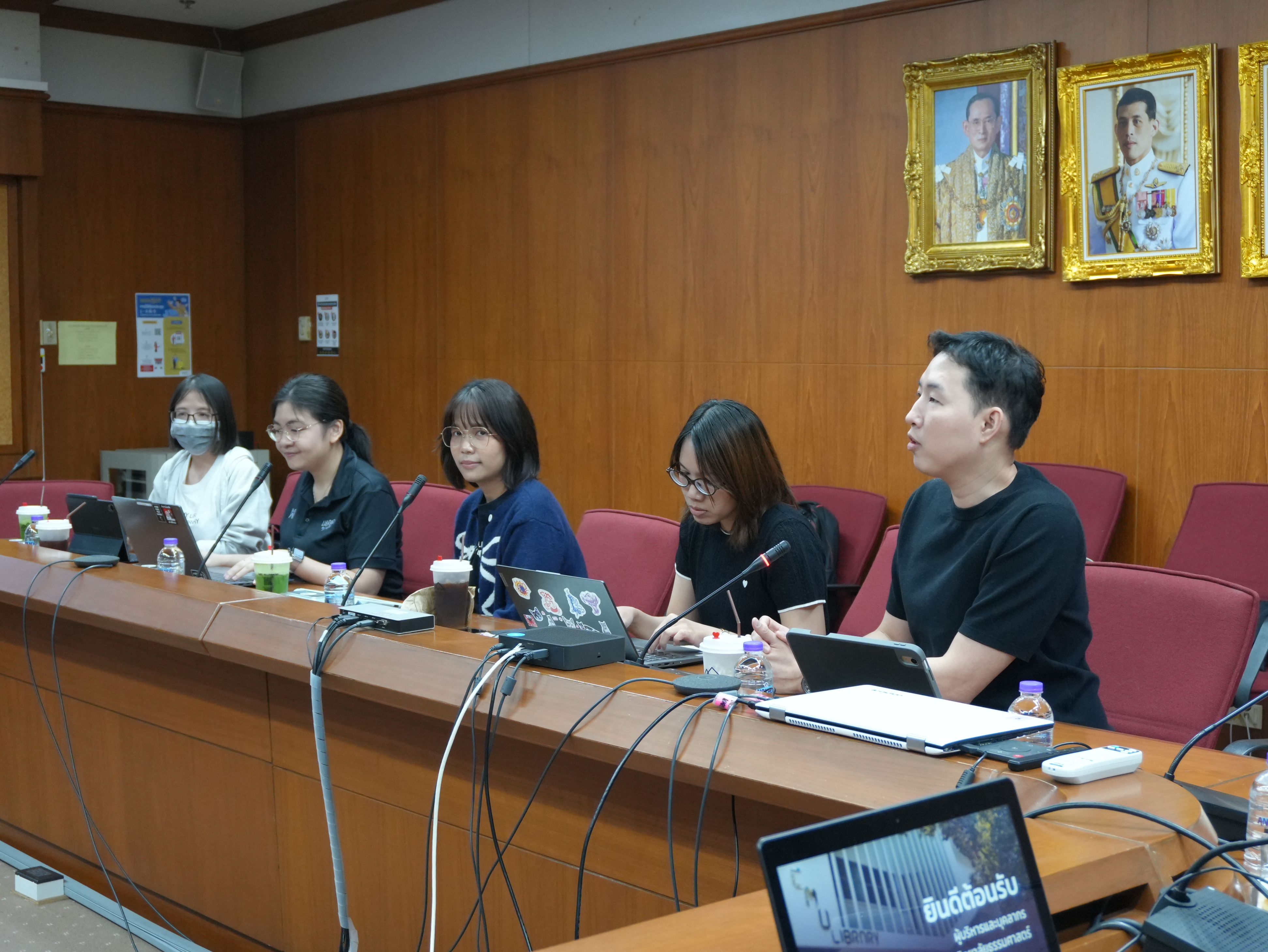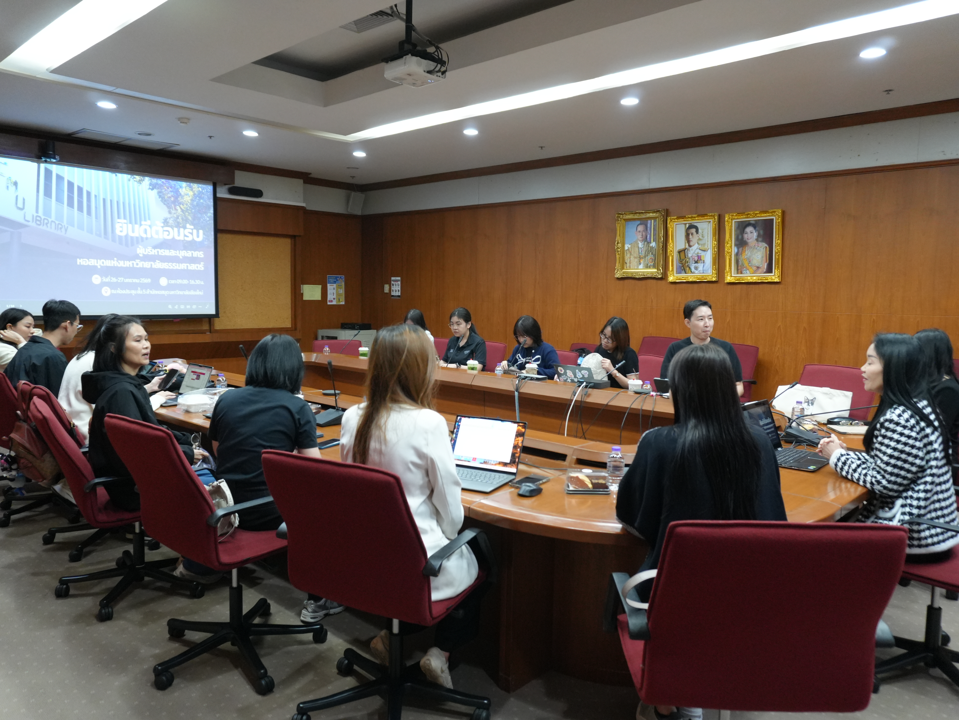 นางอรพรรณ การคนซื่อ รองผู้อำนวยการสำนักหอสมุด และนางทิพวรรณ สุขรวย รองผู้อำนวยการสำนักหอสมุด พร้อมบุคลากรสำนักหอสมุด ให้การต้อนรับพร้อมให้การบรรยาย คณะผู้บริหารและบุคลากรหอสมุดมหาวิทยาลัยธรรมศาสตร์ ในการเข้าศึกษาดูงานการนำระบบห้องสมุดอัตโนมัติ Alma ณ ห้องประชุม 3 ชั้น 5 สำนักหอสมุด ระหว่างวันที่ 26 - 27 มกราคม พ.ศ. 2569