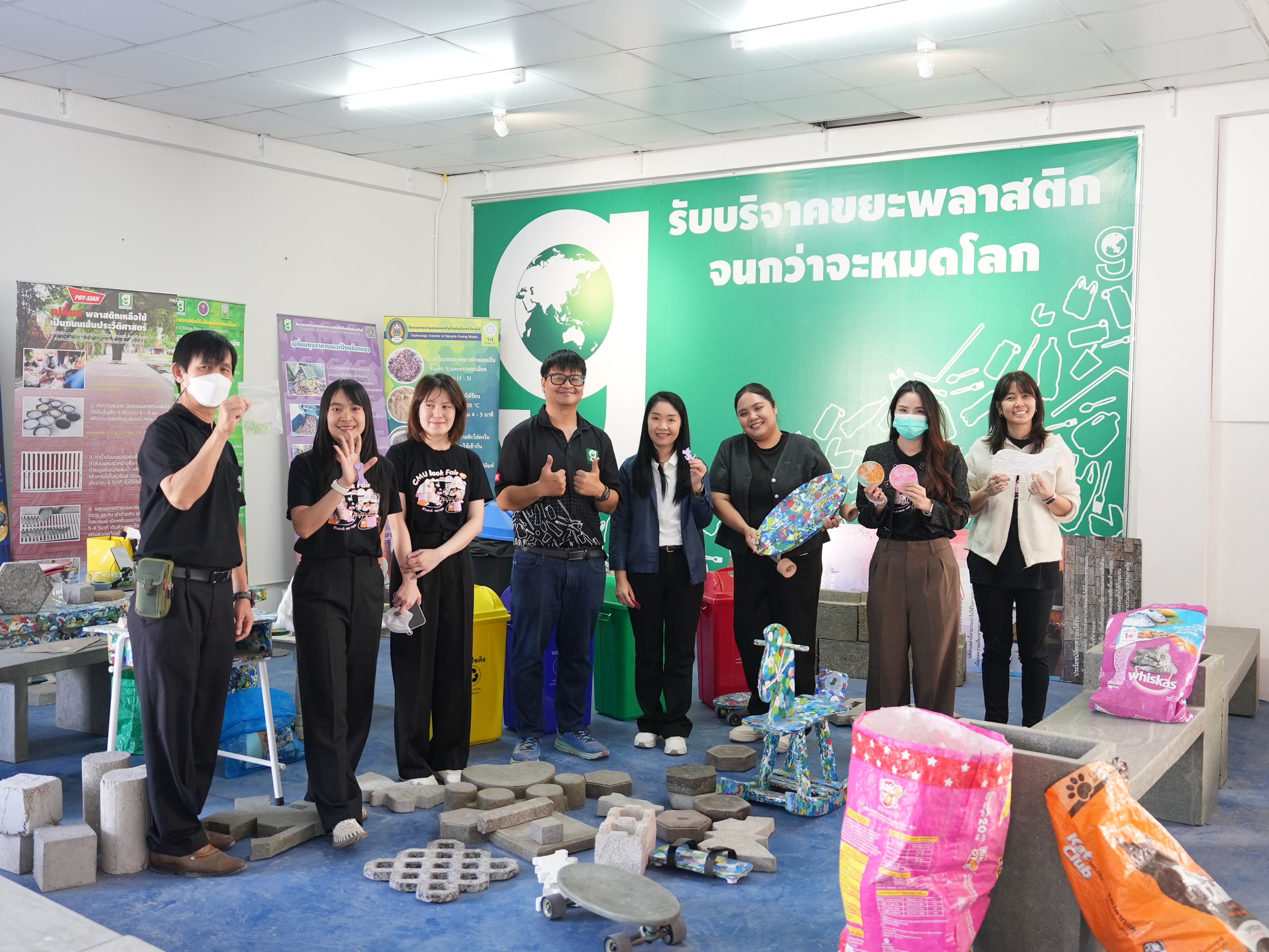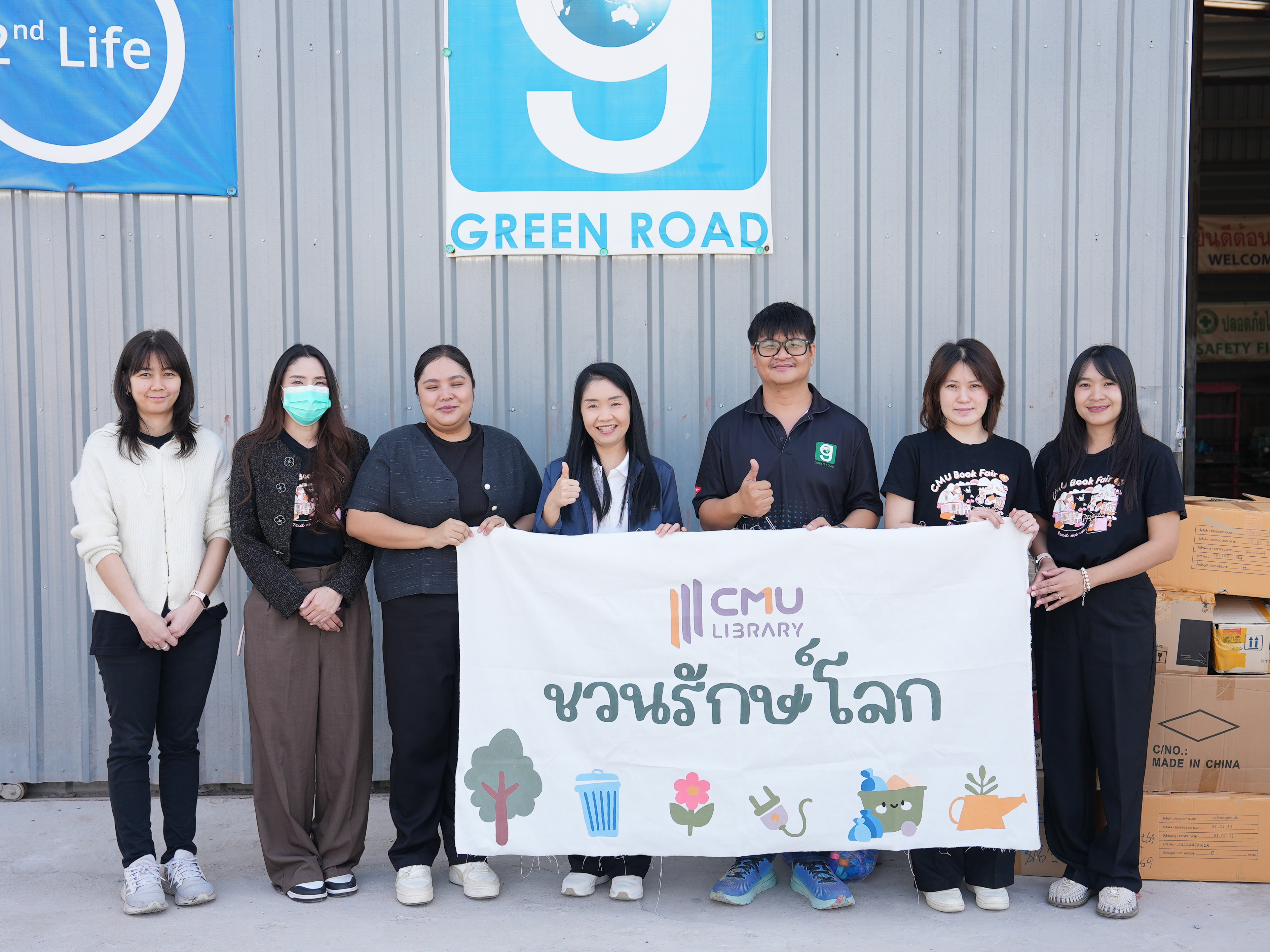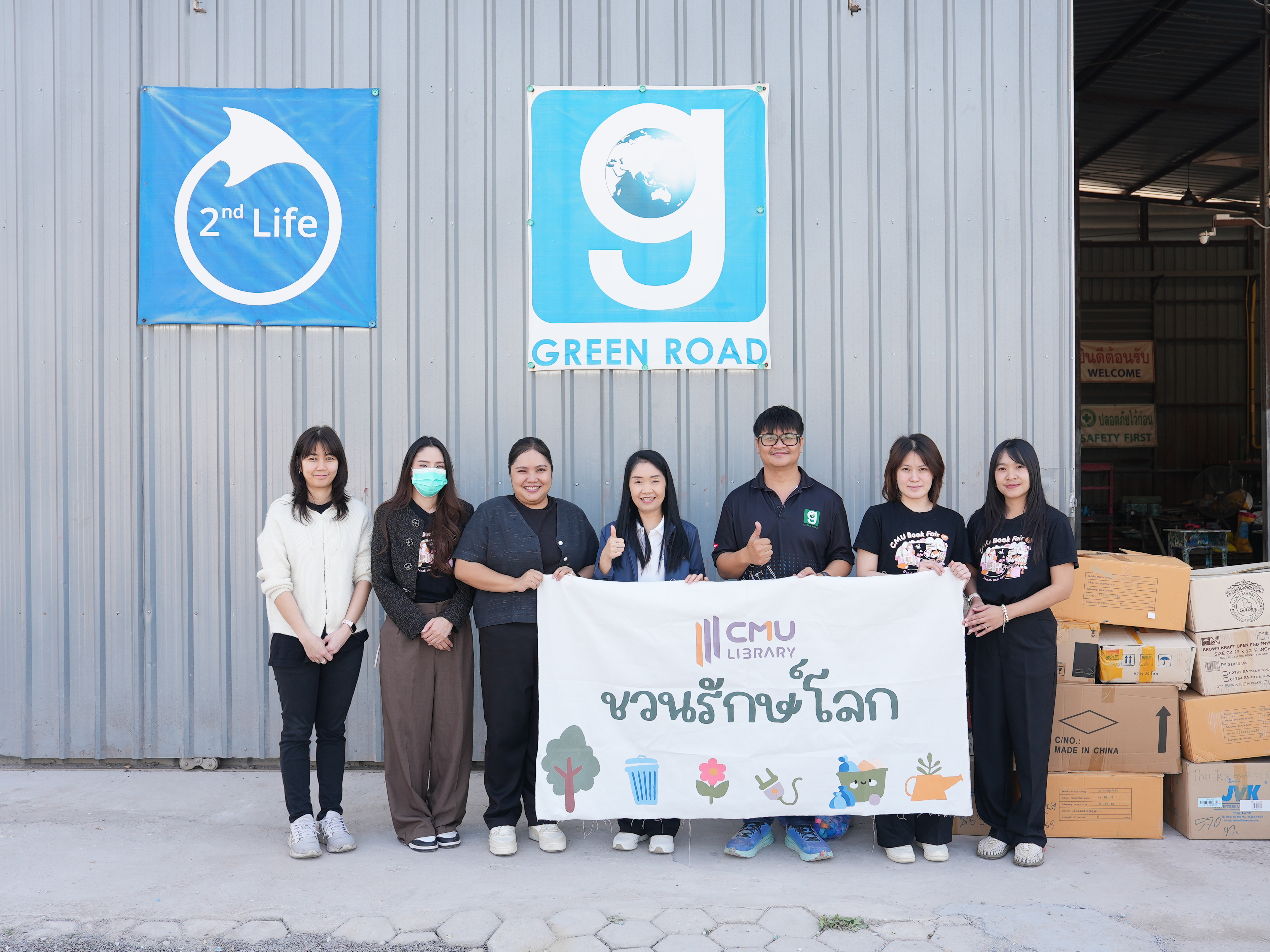 นางทิพวรรณ สุขรวย รองผู้อำนวยการสำนักหอสมุด พร้อมคณะกรรมการฝ่ายส่งเสริมการมีส่วนร่วมของชุมชนและสังคม การจัดงาน CMU Book Fair ครั้งที่ 29 ส่งมอบฝาขวดน้ำในกิจกรรม “ฝาขวดน้ำ แลกของรางวัล” ให้โครงการ “โต๊ะนักเรียนรีไซเคิล (Green Road)” จากการเปิดรับบริจาคฝาขวดน้ำดื่มพลาสติก จัดขึ้นระหว่างวันที่ 25 พฤศจิกายน – 3 ธันวาคม 2568 ในการจัดงาน CMU Book Fair ครั้งที่ 29 เพื่อนำไปผลิตโต๊ะและเก้าอี้มอบให้โรงเรียนที่ขาดแคลน ซึ่งเป็นกิจกรรมการมีส่วนร่วมของชุมชนและสังคม ณ โครงการ GreenRoad ตำบลมะเขือแจ้ อำเภอเมือง จังหวัดลำพูน เมื่อวันที่ 10 กุมภาพันธ์ พ.ศ. 2569