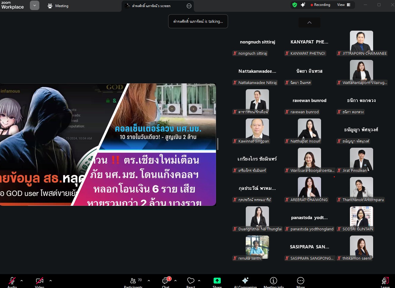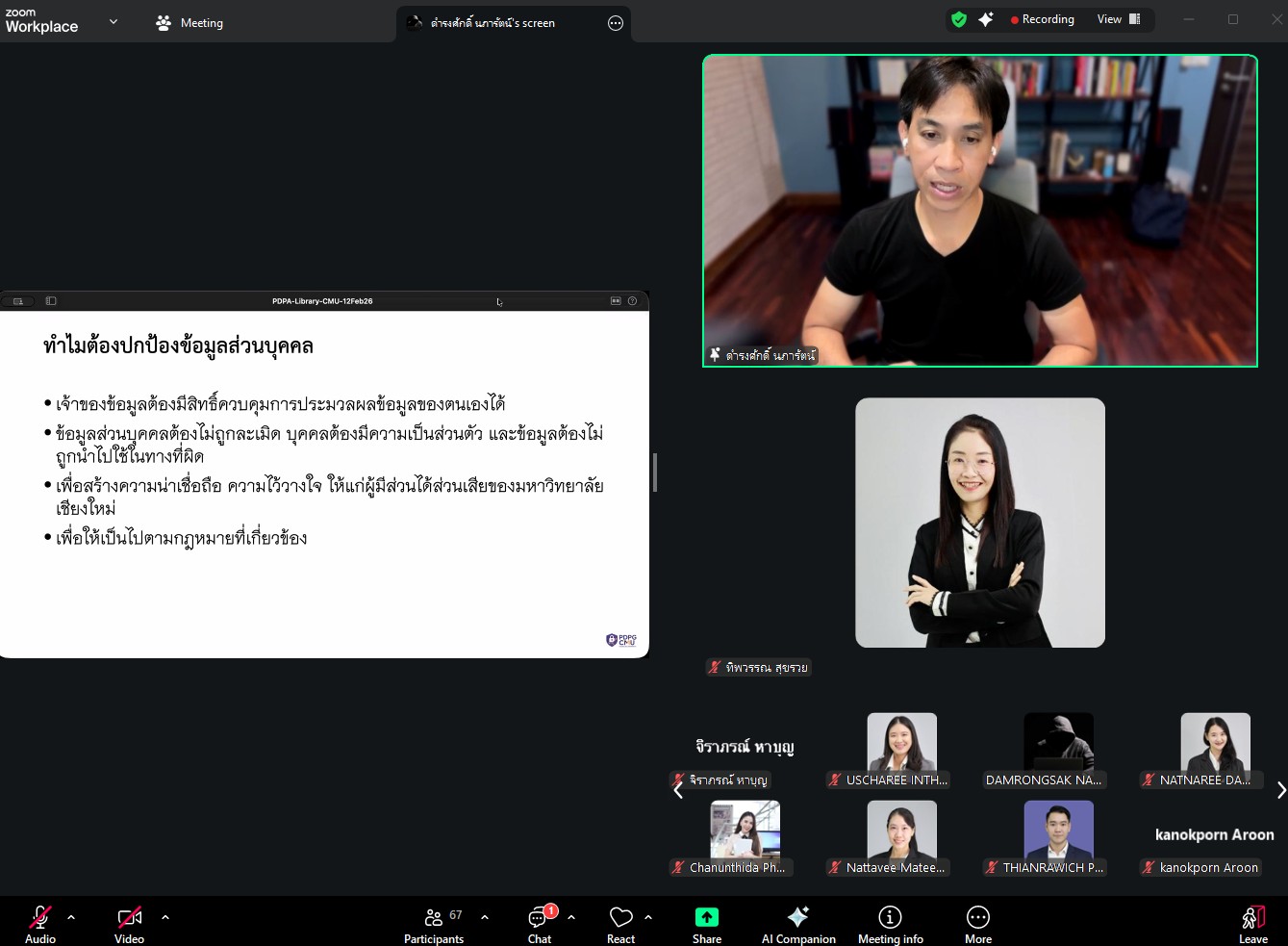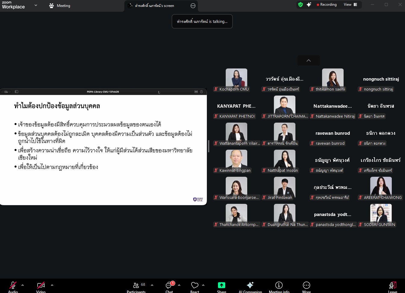 นางทิพวรรณ สุขรวย รองผู้อำนวยการสำนักหอสมุด กล่าวเปิดการบรรยายเรื่อง PDPA และข้อบังคับที่เกี่ยวข้อง ในกิจกรรมเสริมสร้างทักษะด้านเทคโนโลยีสารสนเทศสำหรับบุคลากร โดยมี อาจารย์ ดร.ดำรงศักดิ์ นภารัตน์ รองผู้อำนวยการสำนักบริการเทคโนโลยีสารสนเทศ มหาวิทยาลัยเชียงใหม่ เป็นวิทยากร เพื่อสร้างความตระหนักรู้และเพิ่มศักยภาพบุคลากรให้สามารถปฏิบัติงานได้อย่างมั่นคงปลอดภัย สอดคล้องกับนโยบายด้านการคุ้มครองข้อมูลส่วนบุคคล พ.ร.บ.คุ้มครองข้อมูลส่วนบุคคล พ.ศ. 2562 และแนวปฏิบัติด้านการบริหารจัดการความเสี่ยงจากภัยคุกคามด้าน IT ตลอดจนส่งเสริมการปฏิบัติงานด้าน IT ของบุคลากรให้เป็นไปตามหลักสากล และมีการจัดการความเสี่ยงด้านไซเบอร์อย่างเป็นระบบ ผ่านระบบออนไลน์ Zoom เมื่อวันที่ 12 กุมภาพันธ์ พ.ศ. 2569