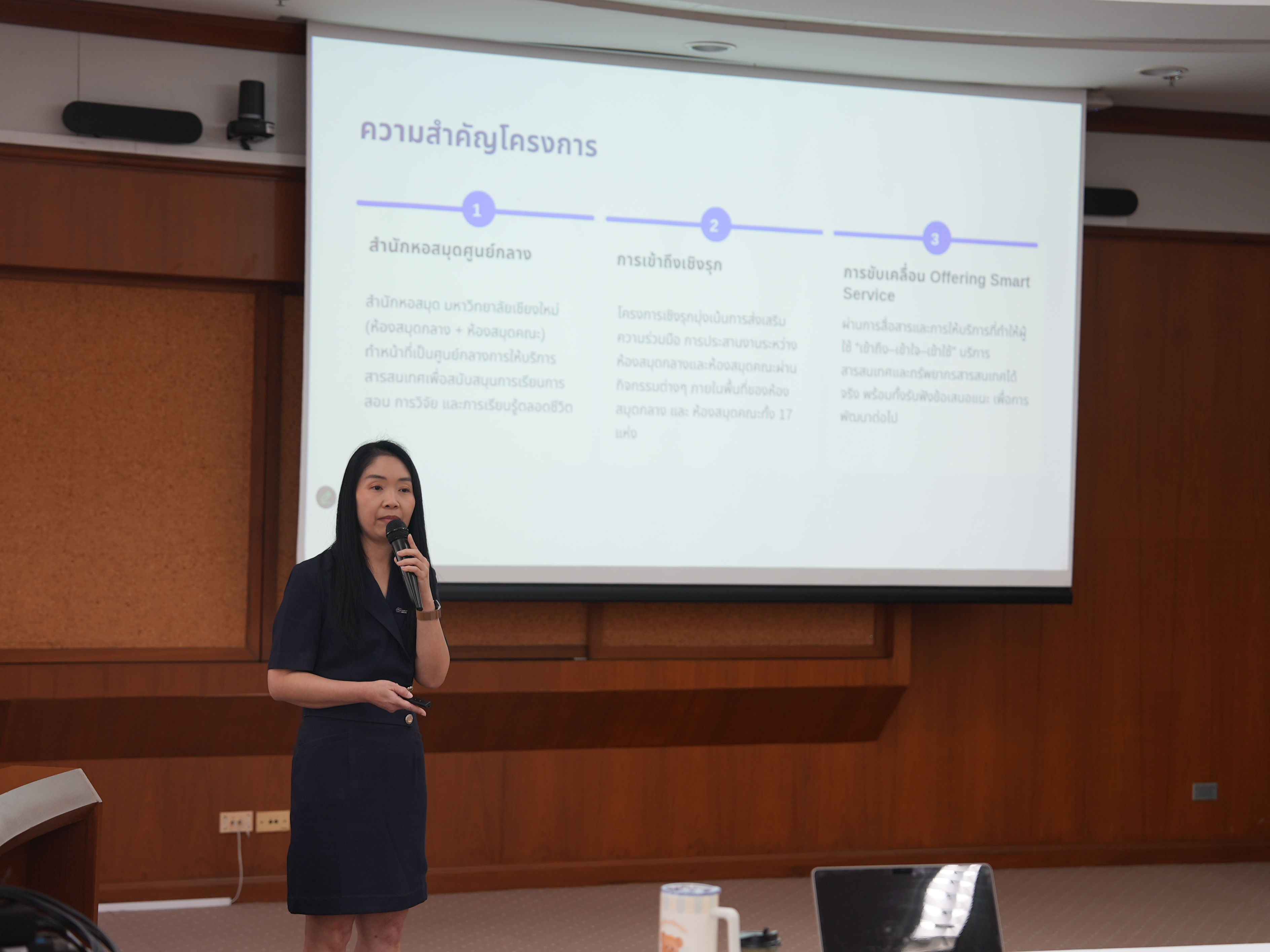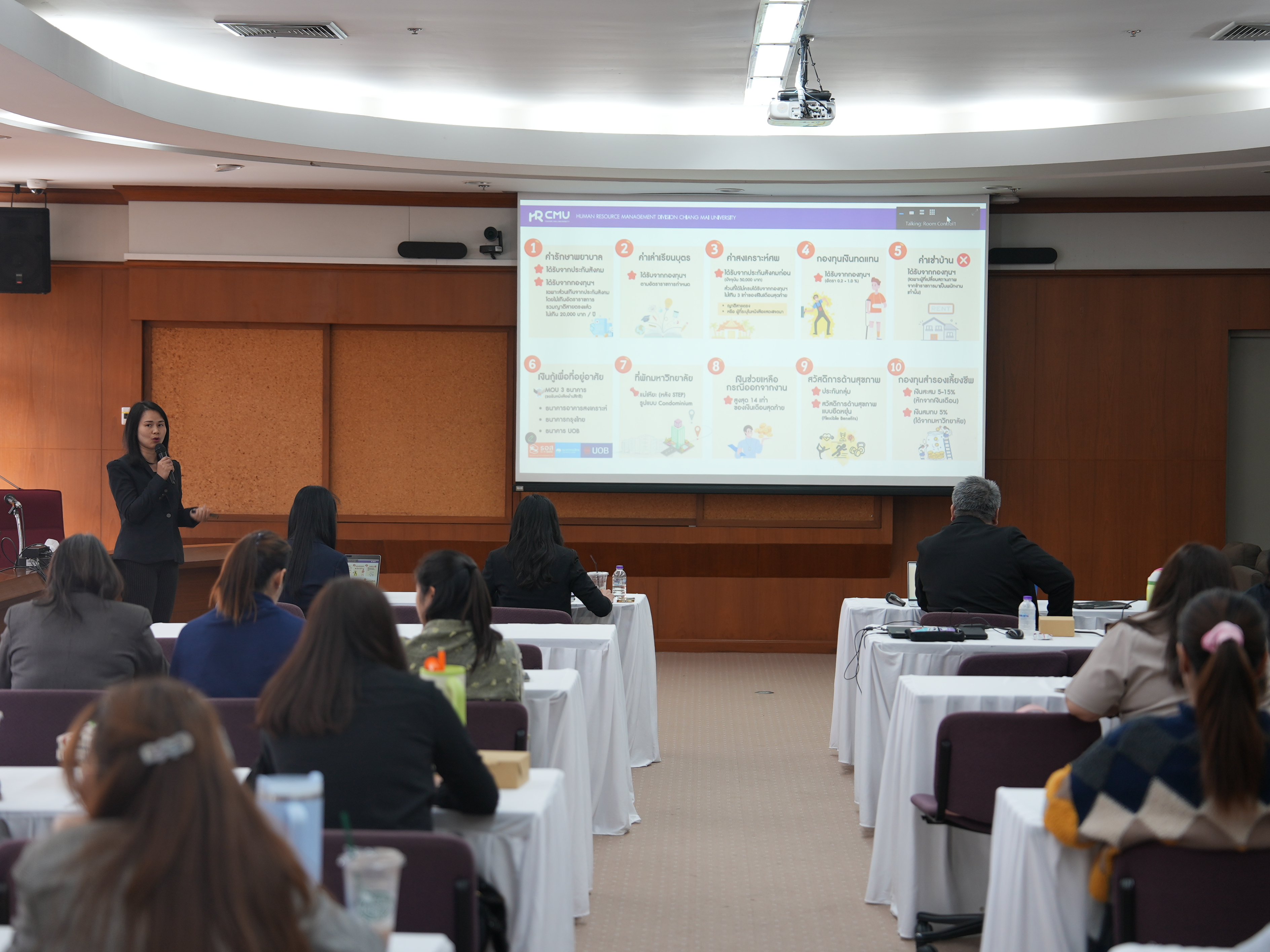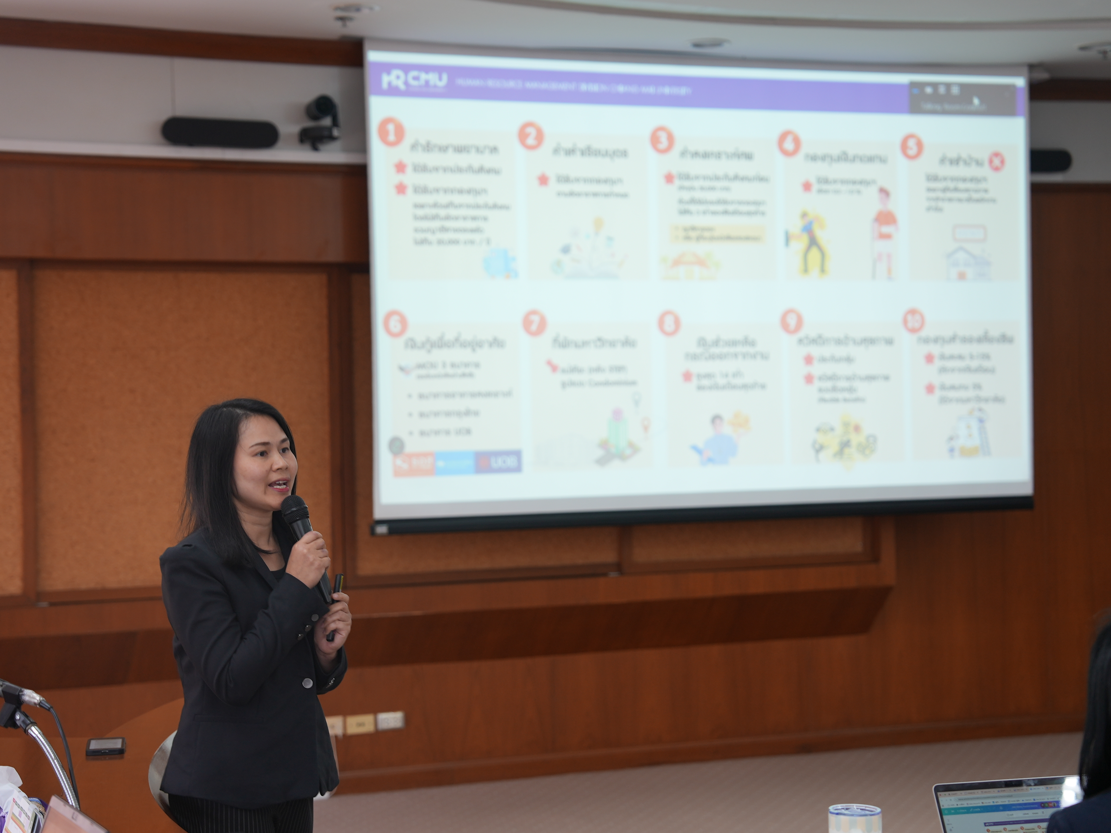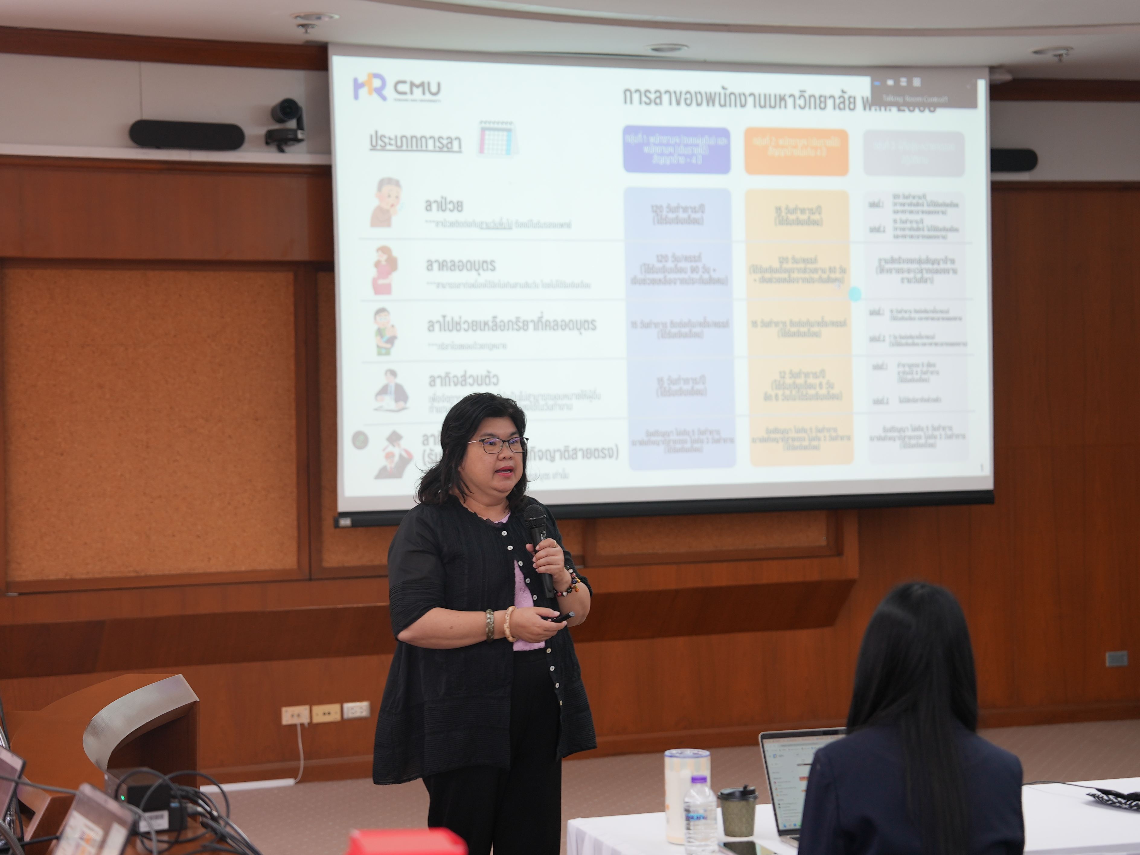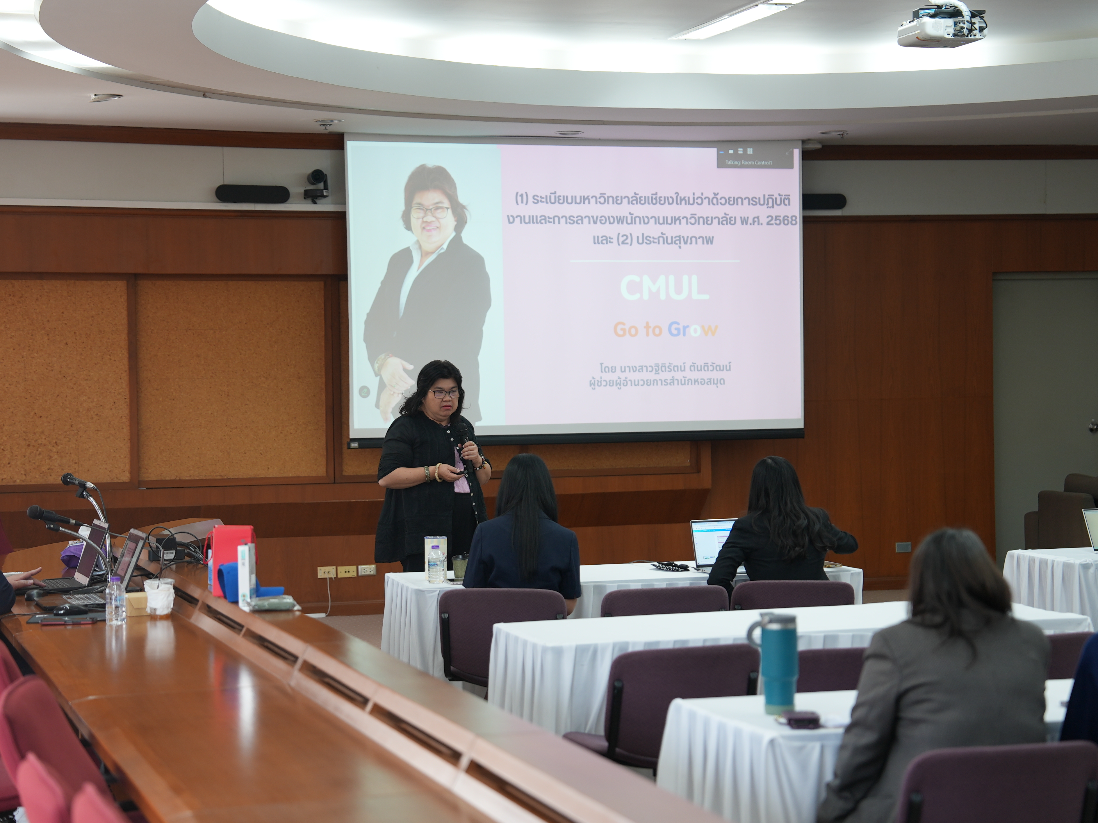นางสาวฐิติรัตน์ ตันติวัฒน์ ผู้ช่วยผู้อำนวยการสำนักหอสมุด อธิบายรายละเอียดเกี่ยวกับระเบียบมหาวิทยาลัยเชียงใหม่ว่าด้วยการปฏิบัติงานและการลา พ.ศ. 2568 รวมถึงสิทธิประโยชน์ด้านประกันสุขภาพ