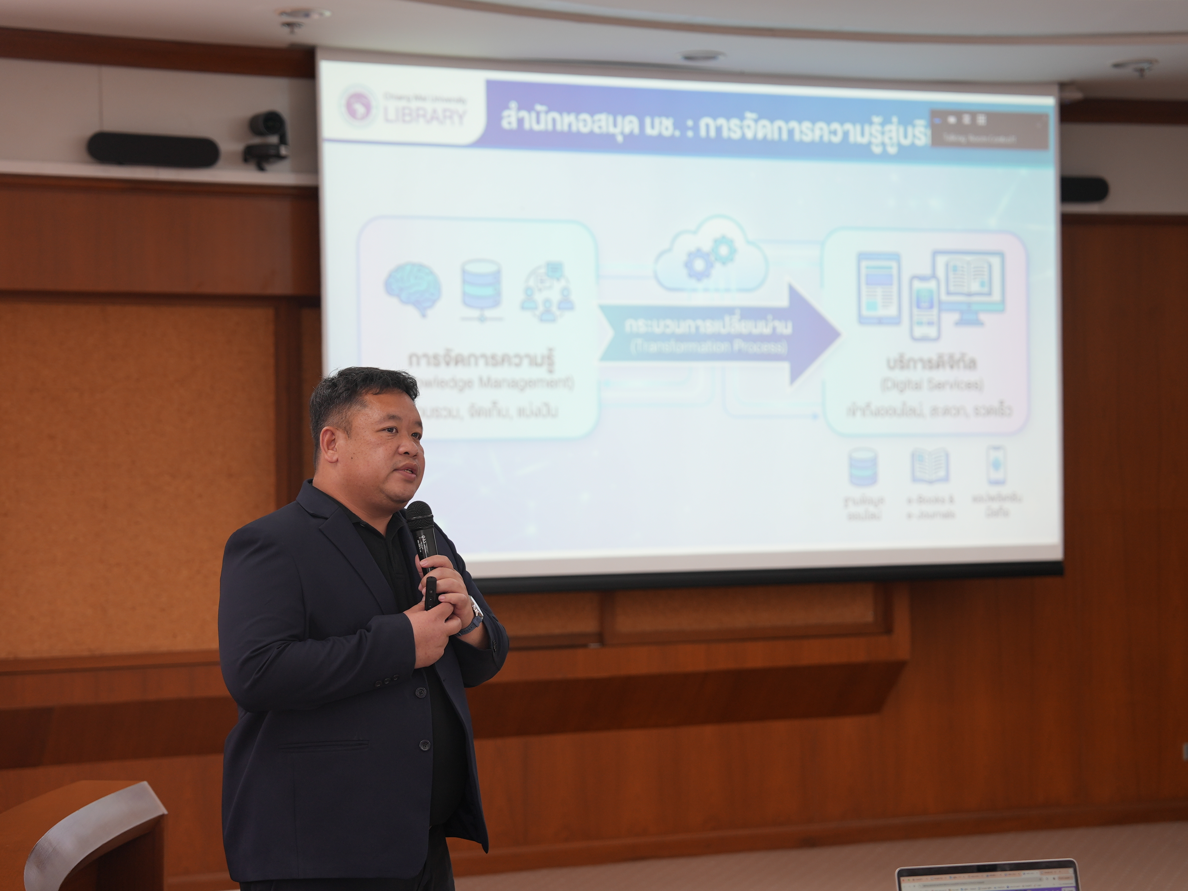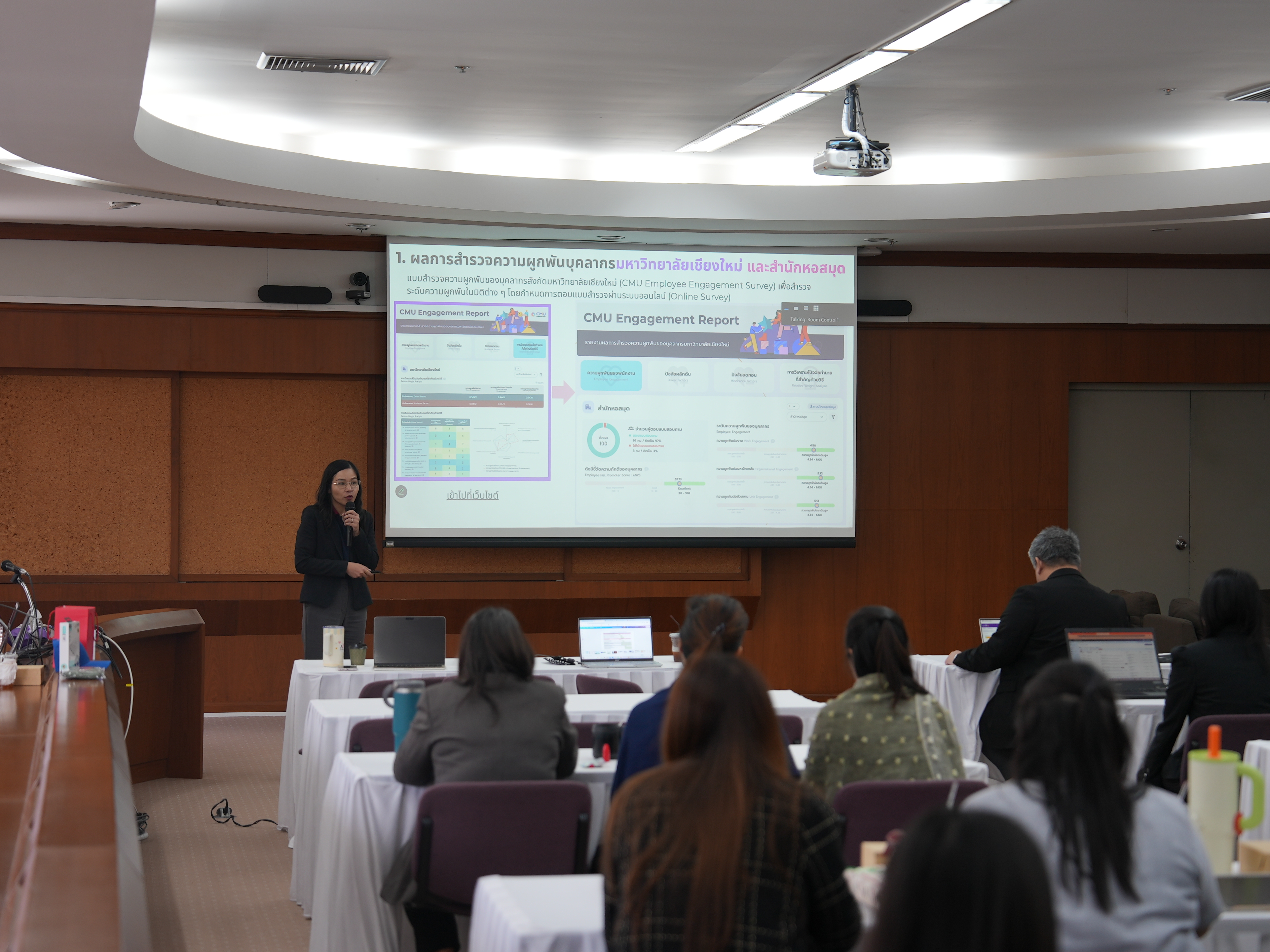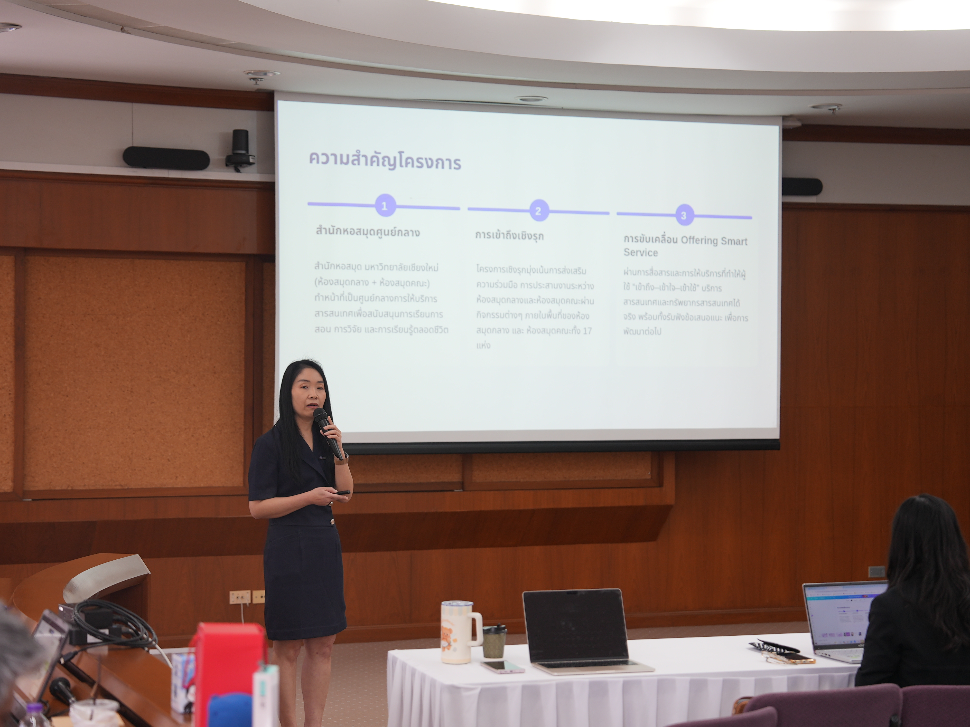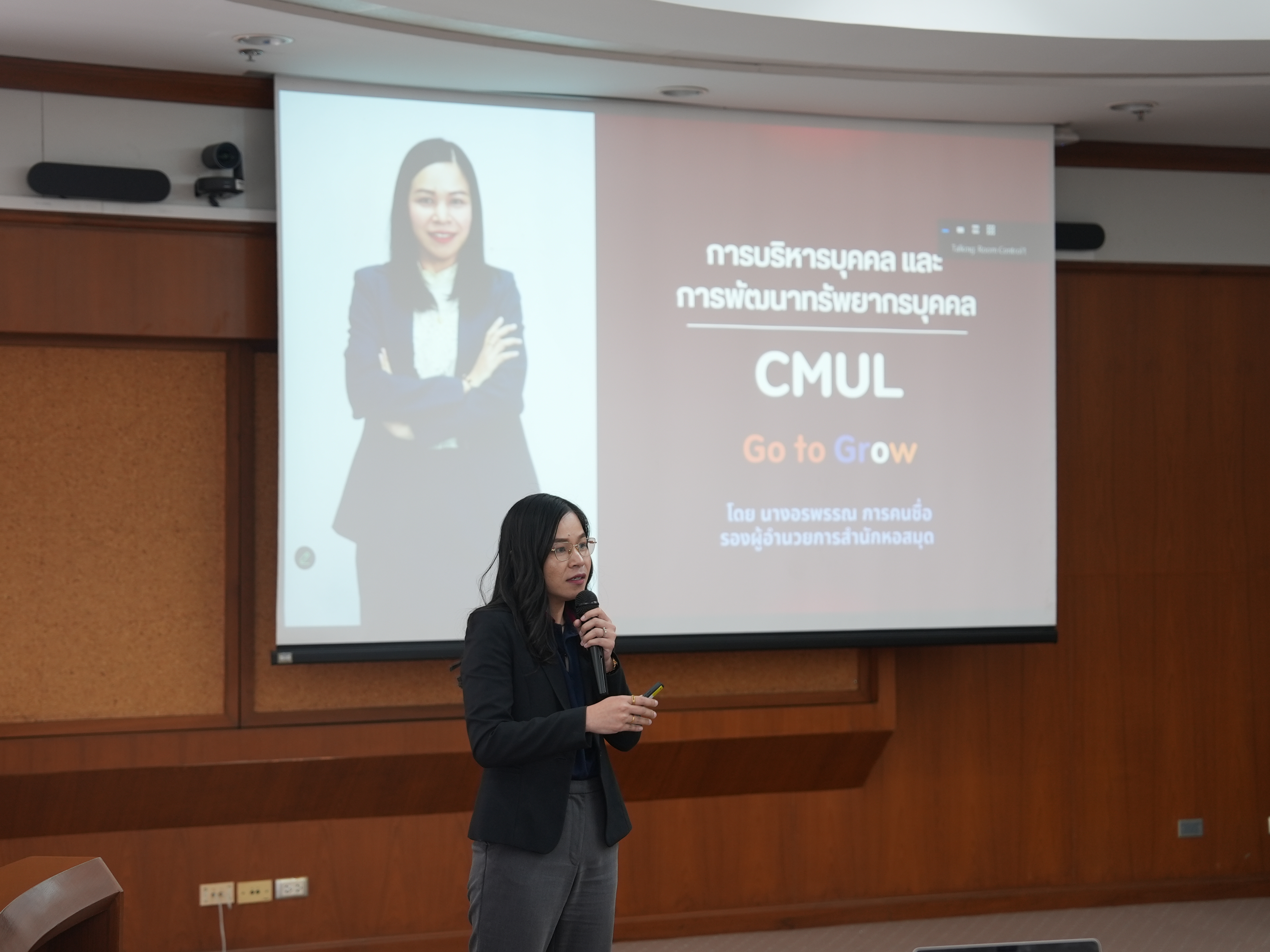 นางสาวฐิติรัตน์ ตันติวัฒน์ ผู้ช่วยผู้อำนวยการสำนักหอสมุด อธิบายรายละเอียดเกี่ยวกับระเบียบมหาวิทยาลัยเชียงใหม่ว่าด้วยการปฏิบัติงานและการลา พ.ศ. 2568 รวมถึงสิทธิประโยชน์ด้านประกันสุขภาพ