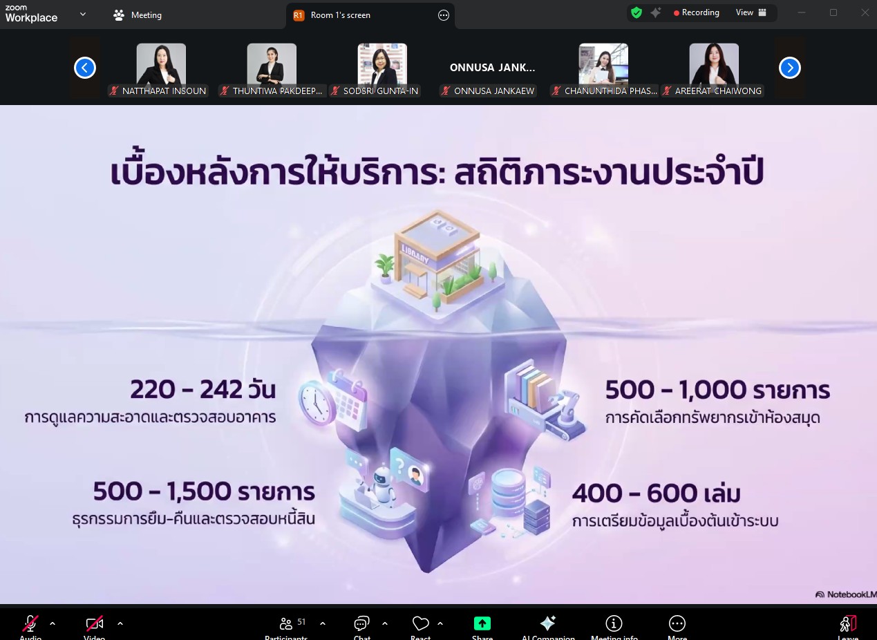 นางทิพวรรณ สุขรวย รองผู้อำนวยการสำนักหอสมุด นำเสนอแนวทางการดำเนินงานด้านบริการ และแผนการจัดกิจกรรมสร้างความสัมพันธ์เชิงรุกกับผู้ใช้บริการ