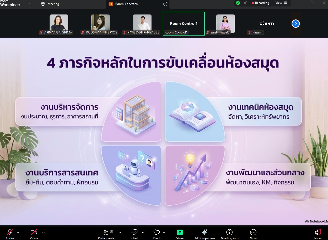 - นางสาวกุลประวีณ์ พรมอารีย์ เลขานุการสำนักหอสมุด สรุปประเด็นด้านสวัสดิการและสิทธิประโยชน์ต่าง ๆ ที่บุคลากรพึงได้รับ เพื่อสร้างขวัญและกำลังใจในการทำงาน