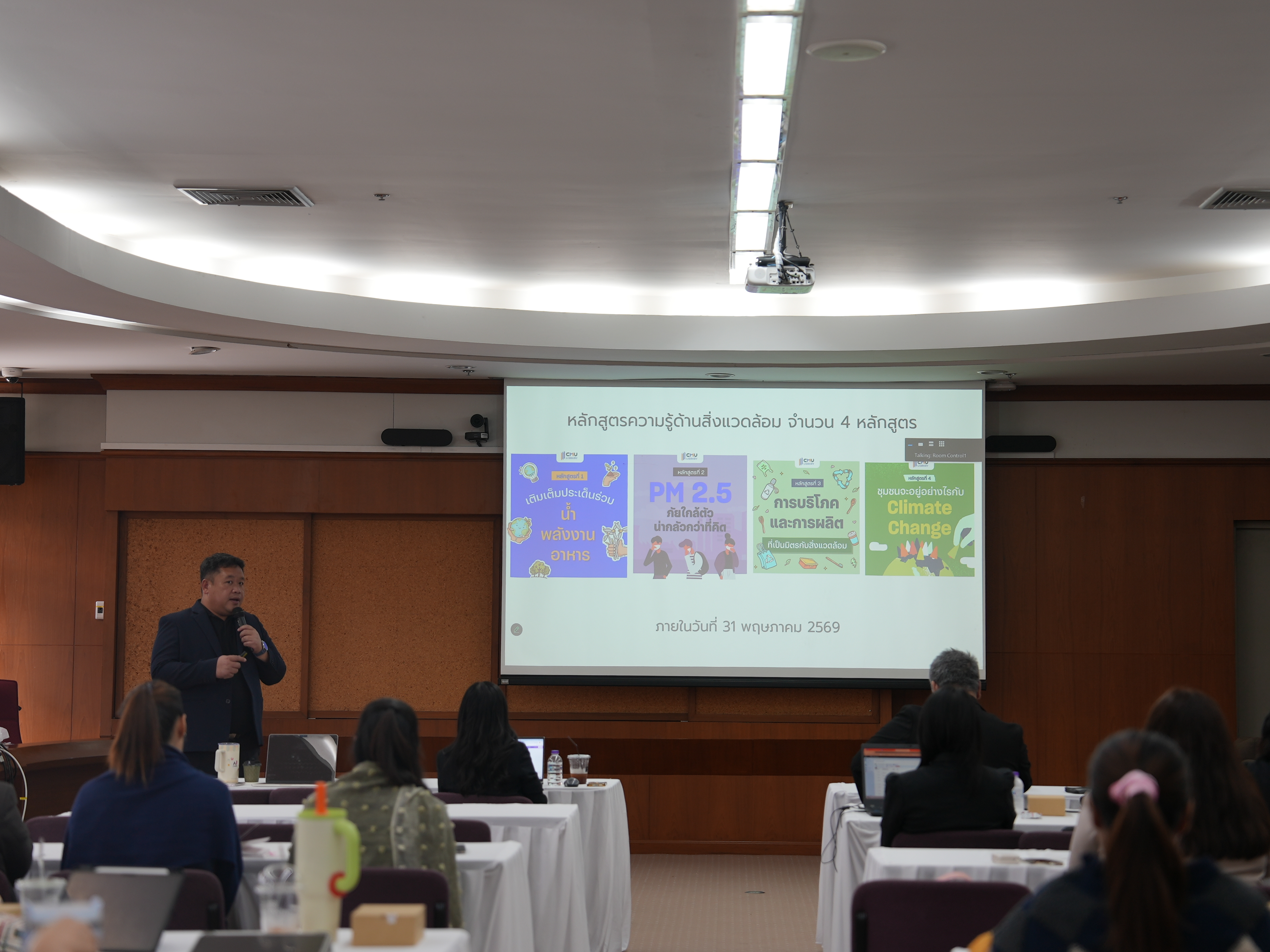 นายธนะพันธุ์ การคนซื่อ ผู้ช่วยผู้อำนวยการสำนักหอสมุด นำเสนอแนวทางด้านการจัดการความรู้ (KM) และการจัดอบรมหลักสูตรด้านสิ่งแวดล้อม เพื่อมุ่งสู่การเป็นห้องสมุดสีเขียว