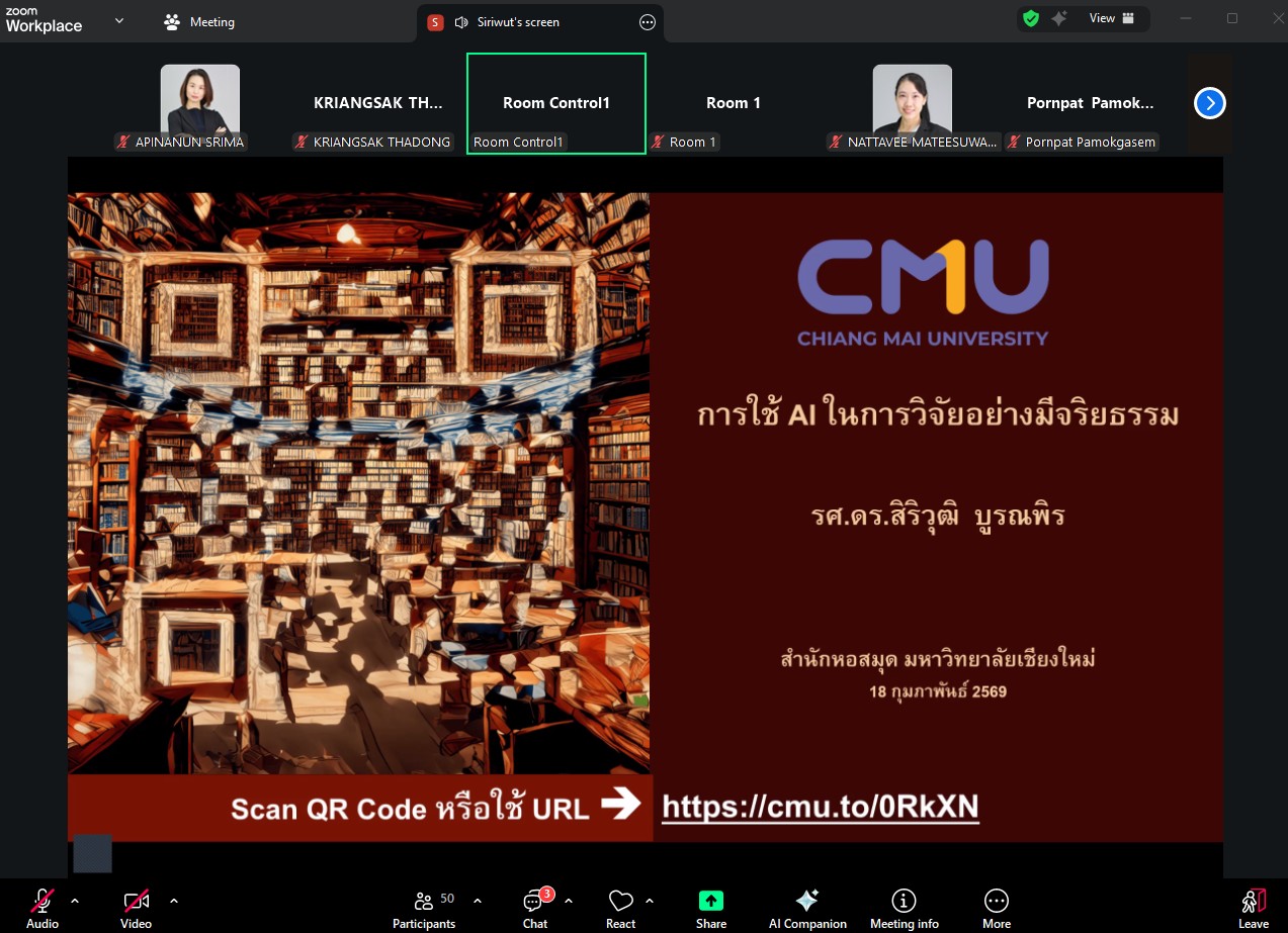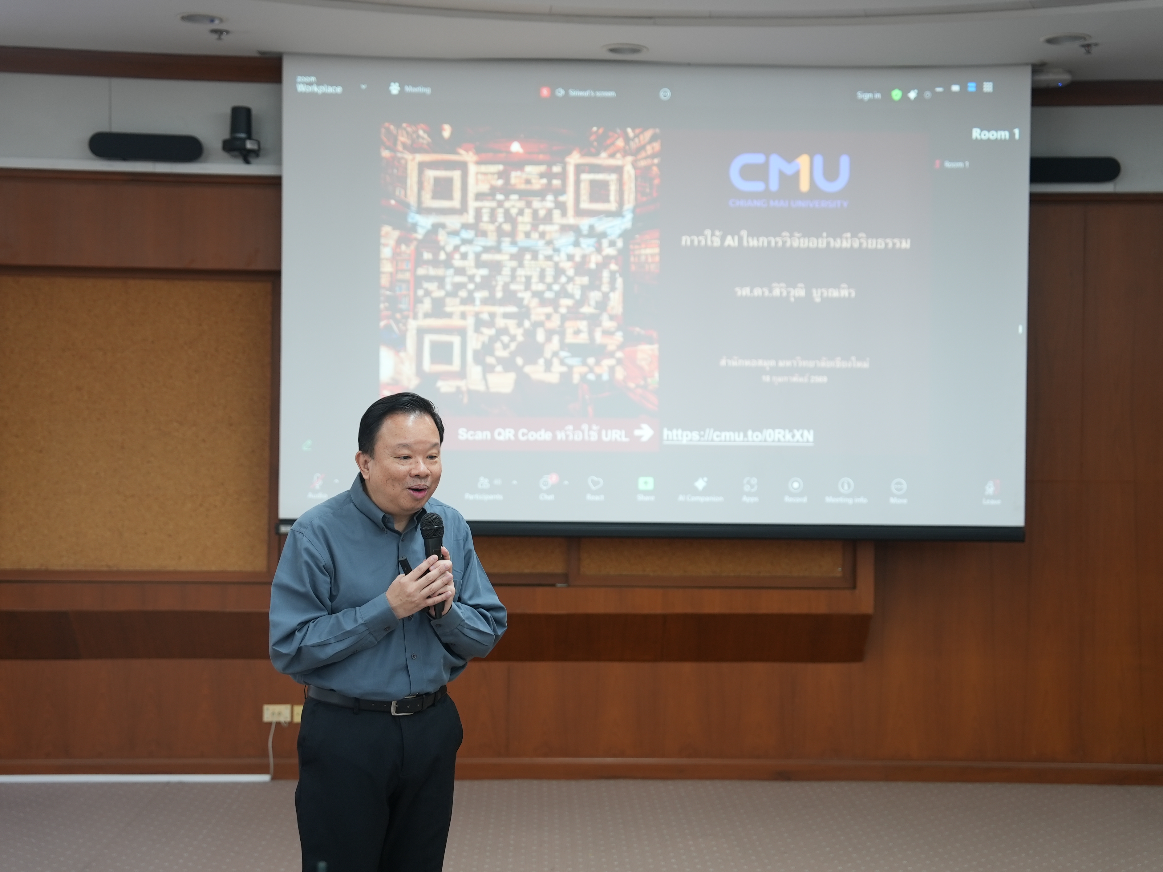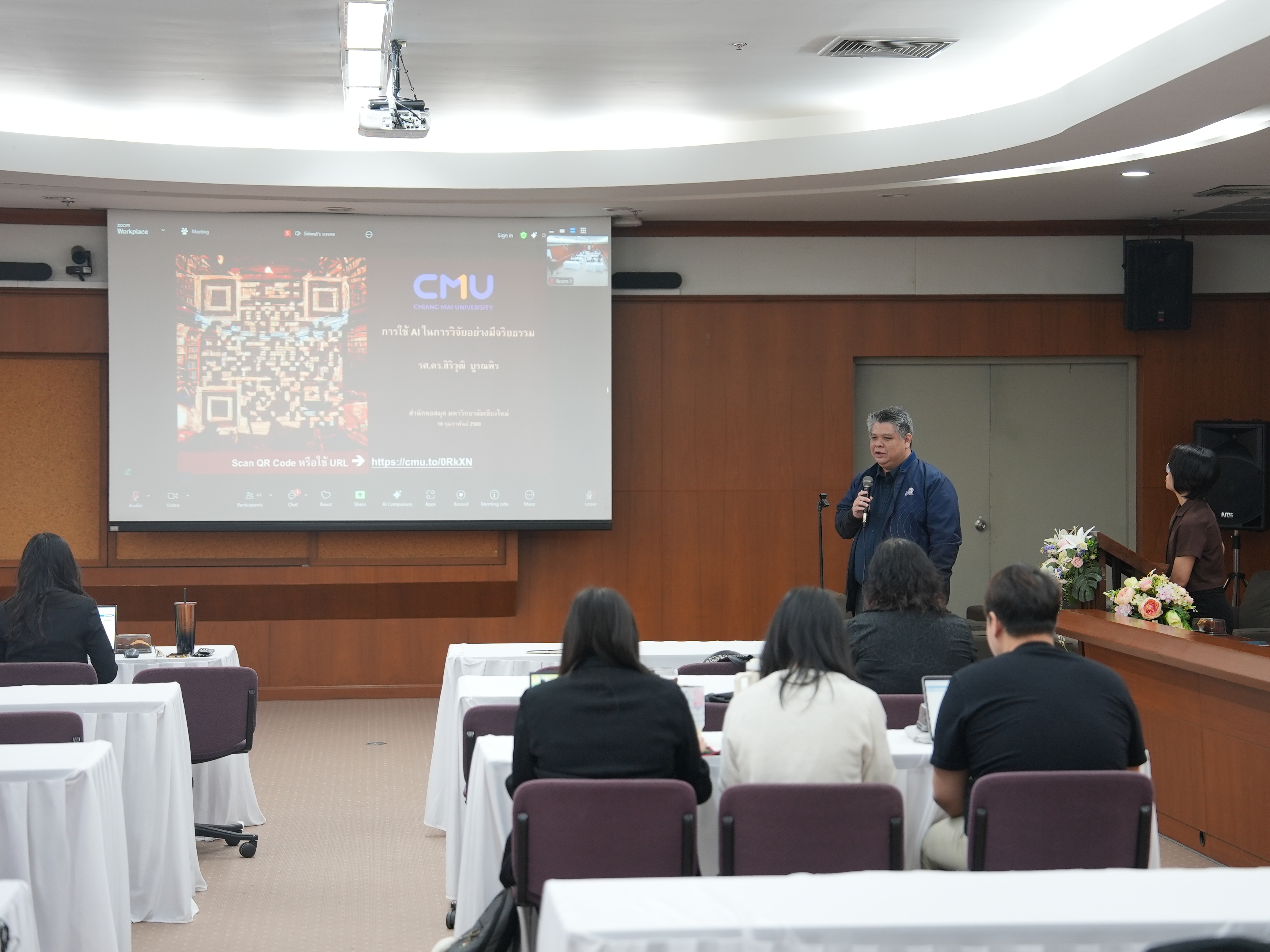 นายปราชญ์ สงวนศักดิ์ ผู้อำนวยการสำนักหอสมุด กล่าวเปิดกิจกรรมการบรรยาย เรื่อง "AI กับงานวิจัย และจริยธรรมการใช้" ภายใต้โครงการส่งเสริมการวิจัยบุคลากรสำนักหอสมุด ประจำปีงบประมาณ 2569 โดยมี รองศาสตราจารย์ ดร. สิริวุฒิ บูรณพิร อาจารย์ประจำคณะบริหารธุรกิจ มหาวิทยาลัยเชียงใหม่ เป็นวิทยากร เพื่อเสริมสร้างความรู้และความเข้าใจเกี่ยวกับการประยุกต์ใช้ปัญญาประดิษฐ์ ในการดำเนินงานวิจัยอย่างมีประสิทธิภาพ สร้างความตระหนักรู้ด้านจริยธรรม ความรับผิดชอบ และแนวทางการใช้ AI อย่างเหมาะสมตามหลักวิชาการ ตลอดจนส่งเสริมให้บุคลากรสามารถนำความรู้ที่ได้รับไปประยุกต์ใช้ในการพัฒนางานวิจัยและงานประจำได้อย่างมีคุณภาพ ณ ห้องประชุม 1 ชั้น 5 สำนักหอสมุด และผ่านระบบออนไลน์ Zoom เมื่อวันที่ 18 กุมภาพันธ์ พ.ศ. 2569
