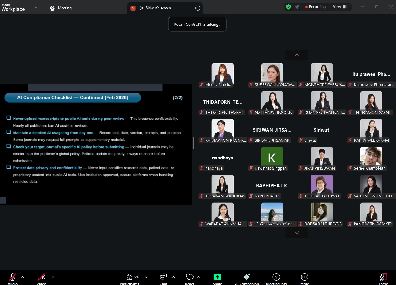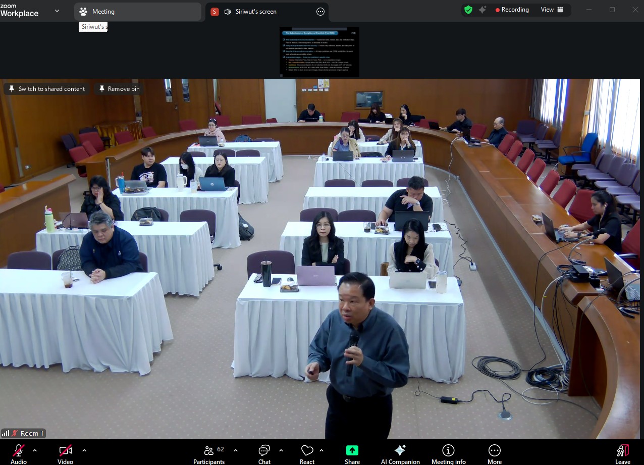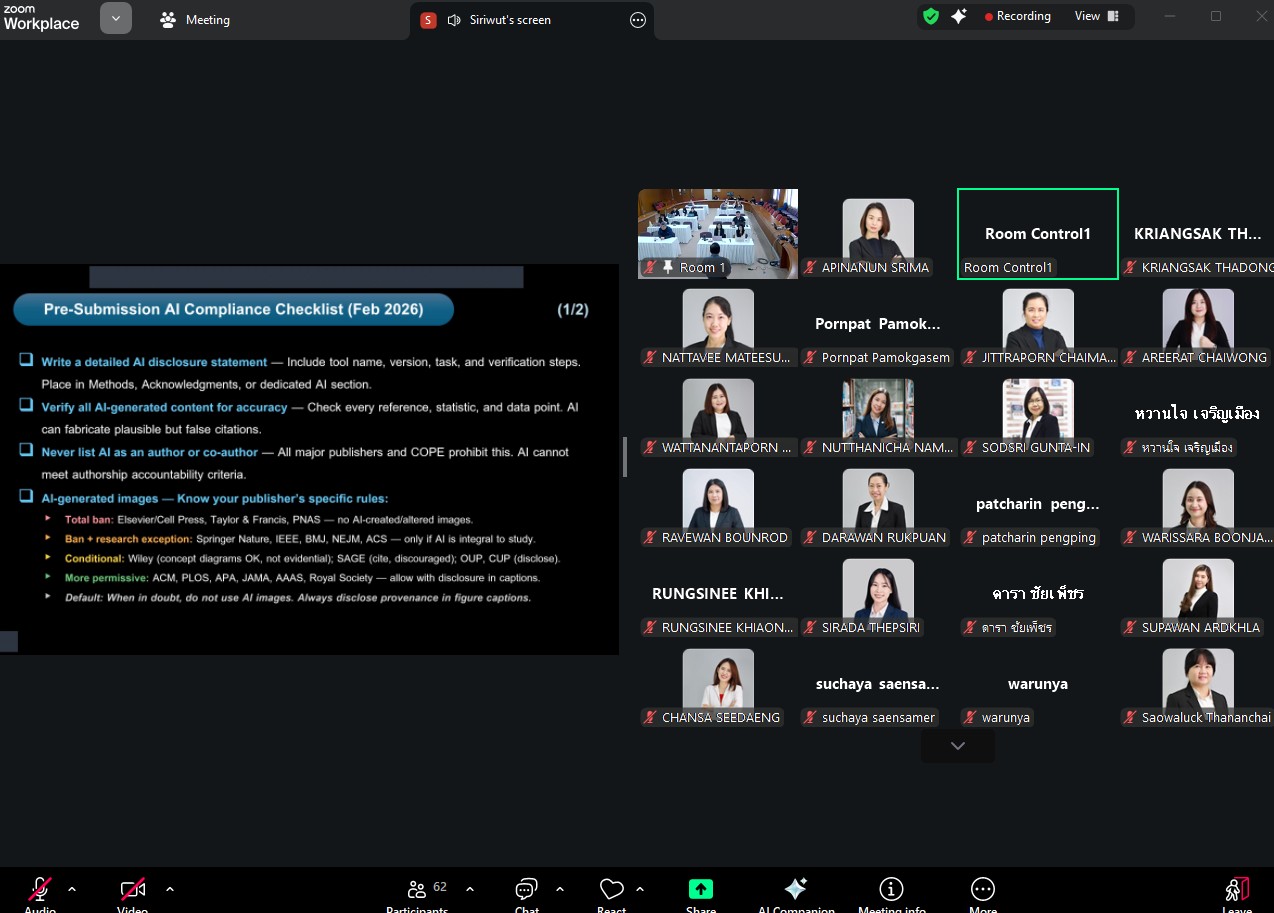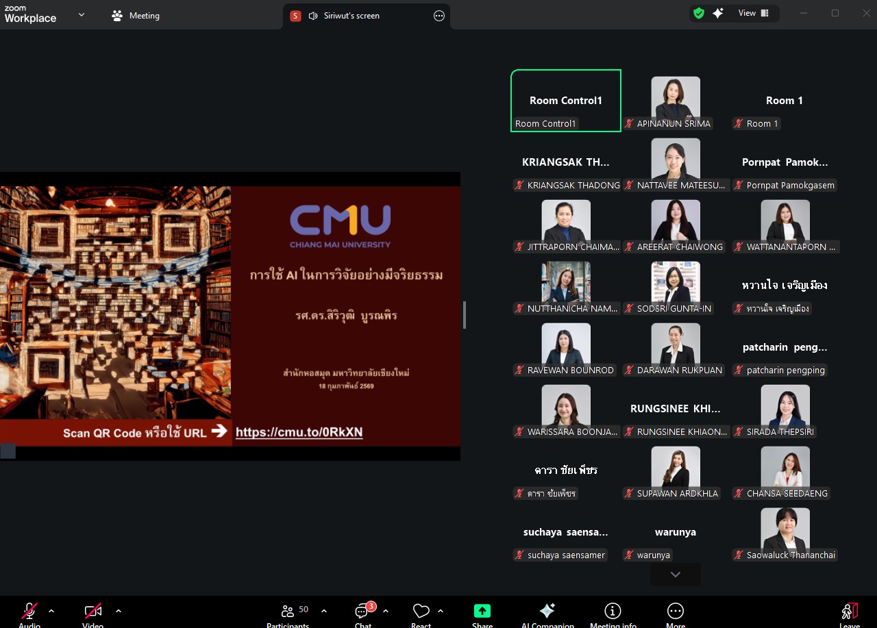 นายปราชญ์ สงวนศักดิ์ ผู้อำนวยการสำนักหอสมุด กล่าวเปิดกิจกรรมการบรรยาย เรื่อง "AI กับงานวิจัย และจริยธรรมการใช้" ภายใต้โครงการส่งเสริมการวิจัยบุคลากรสำนักหอสมุด ประจำปีงบประมาณ 2569 โดยมี รองศาสตราจารย์ ดร. สิริวุฒิ บูรณพิร อาจารย์ประจำคณะบริหารธุรกิจ มหาวิทยาลัยเชียงใหม่ เป็นวิทยากร เพื่อเสริมสร้างความรู้และความเข้าใจเกี่ยวกับการประยุกต์ใช้ปัญญาประดิษฐ์ ในการดำเนินงานวิจัยอย่างมีประสิทธิภาพ สร้างความตระหนักรู้ด้านจริยธรรม ความรับผิดชอบ และแนวทางการใช้ AI อย่างเหมาะสมตามหลักวิชาการ ตลอดจนส่งเสริมให้บุคลากรสามารถนำความรู้ที่ได้รับไปประยุกต์ใช้ในการพัฒนางานวิจัยและงานประจำได้อย่างมีคุณภาพ ณ ห้องประชุม 1 ชั้น 5 สำนักหอสมุด และผ่านระบบออนไลน์ Zoom เมื่อวันที่ 18 กุมภาพันธ์ พ.ศ. 2569