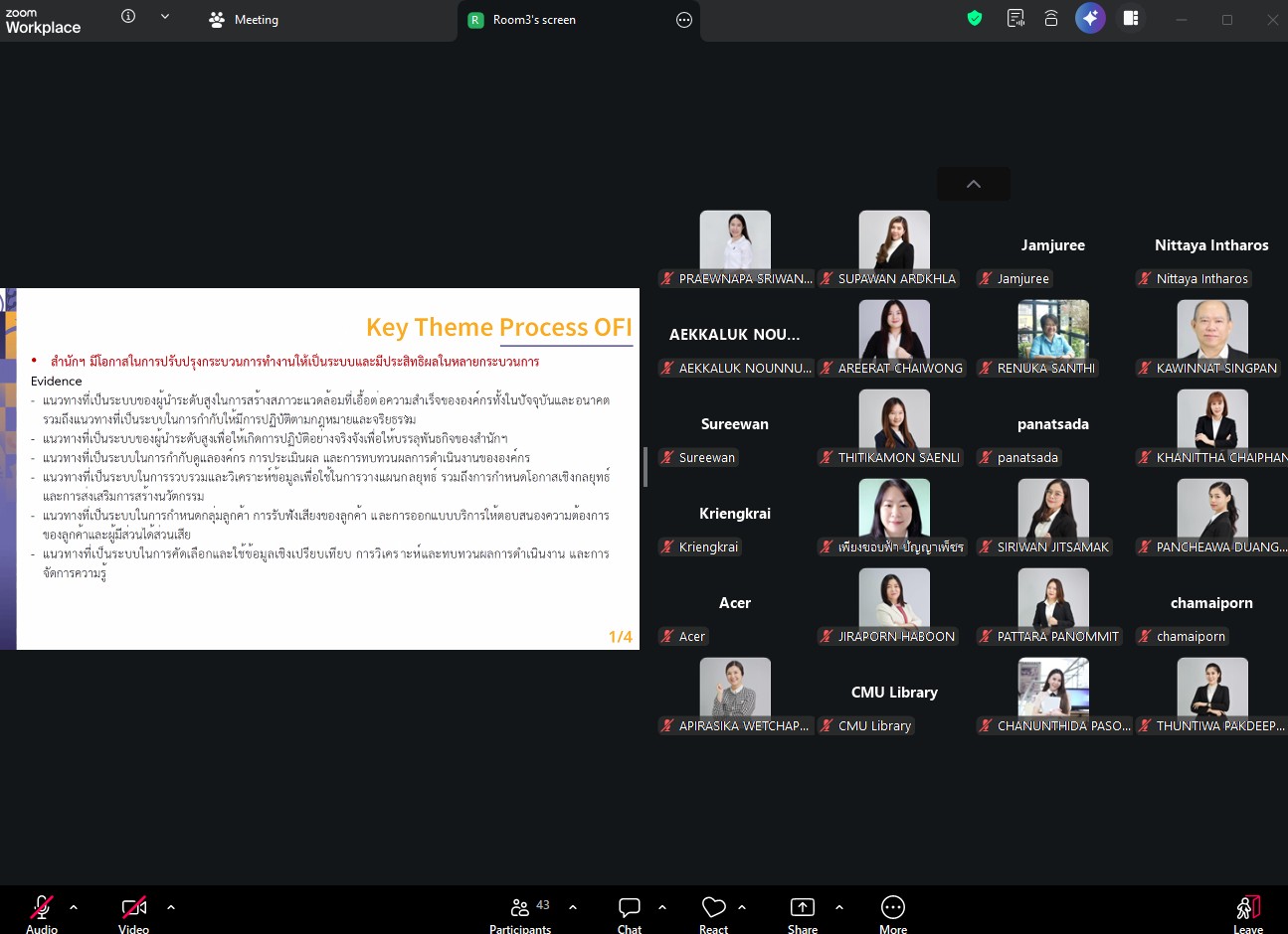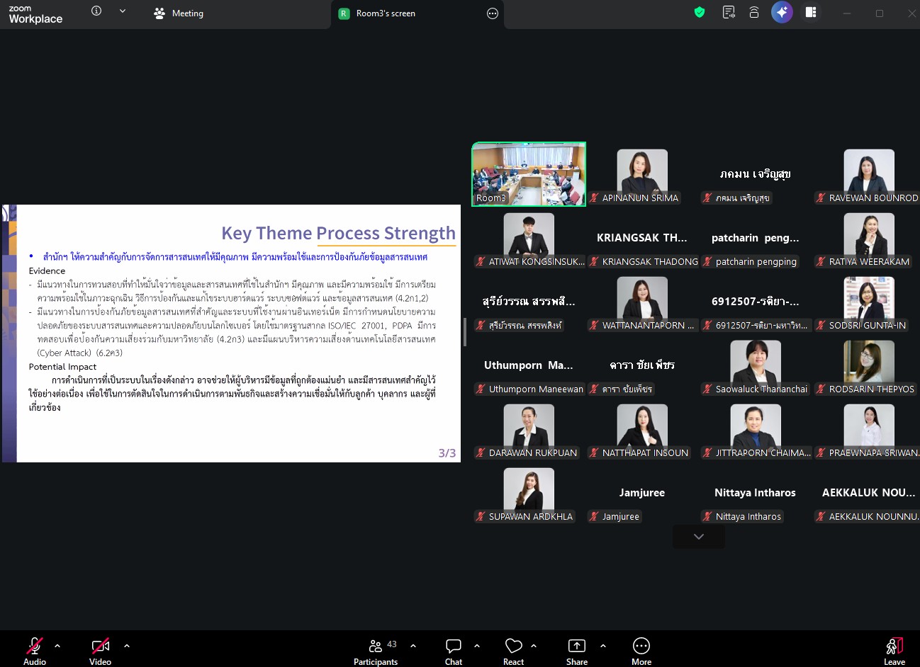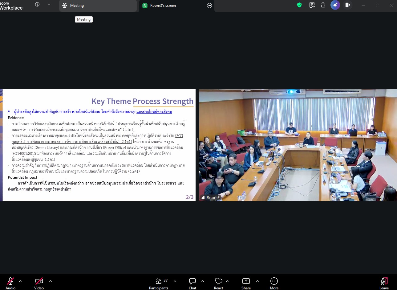 โอกาสนี้ บุคลากรสำนักหอสมุดได้เข้าร่วมรับฟังการให้ข้อมูลย้อนกลับ (Key themes) โดยกรรมการผู้ตรวจประเมินได้ให้ข้อเสนอแนะด้าน Key Theme Process Strength ดังนี้ สำนักหอสมุดให้ความสำคัญกับการจัดการสารสนเทศให้มีคุณภาพ มีความพร้อมใช้และมีการป้องกันภัยข้อมูลสารสนเทศ ซึ่งการทำงานที่เป็นระบบส่งผลให้ผู้บริหารได้รับข้อมูลถูกต้องแม่นยำ มีสารสนเทศสำคัญไว้นำไปใช้อย่างต่อเนื่อง เพื่อนำไปใช้ในการตัดสินใจในการดำเนินการตามพันธกิจ อีกทั้งเป็นการสร้างความเชื่อมั่นให้กับผู้ใช้บริการ และข้อเสนอแนะด้าน Key Theme Process OFI ดังนี้ สำนักหอสมุดมีโอกาสในการปรับปรุงกระบวนการทำงานให้เป็นระบบ และมีประสิทธิผลในหลายกระบวนการ ณ ห้องประชุม 1 ชั้น 5 สำนักหอสมุด และผ่านโปรแกรมออนไลน์ Zoom เมื่อวันที่ 31 มีนาคม พ.ศ. 2569 ณ สำนักหอสมุด