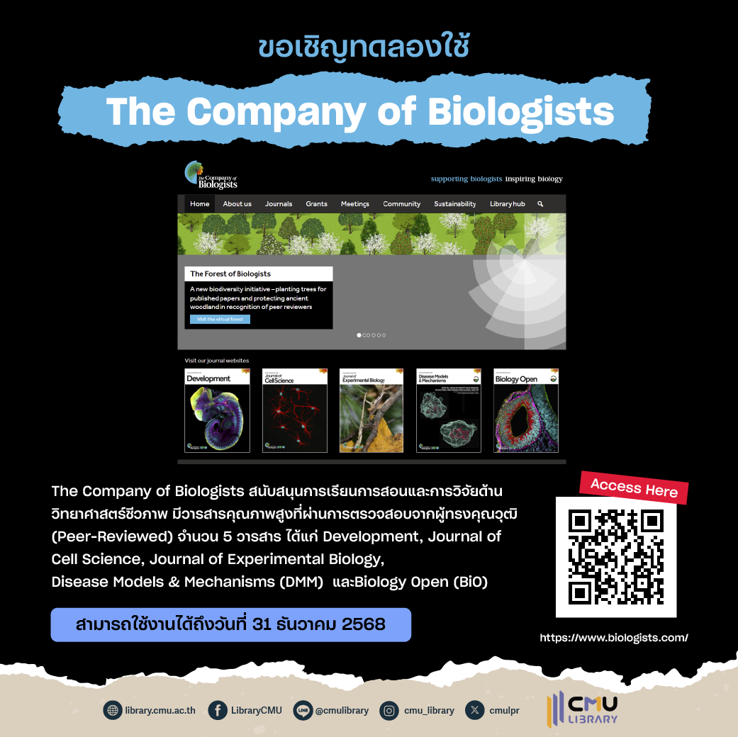 The Company of Biologists ฐานข้อมูลด้านวิทยาศาสตร์ชีวภาพ มีวารสารคุณภาพสูงที่ผ่านการตรวจสอบจากผู้ทรงคุณวุฒิ (Peer-Reviewed) จำนวน 5 วารสาร ได้แก่ Development, Journal Cell Science, Experimental Biology, Disease Models & Mechanisms (DMM) และ Biology Open (BiO) สามารถเข้าใช้งาน ได้ที่ https://www.biologists.com ได้ถึงวันที่ 30 พฤศจิกายน 2568