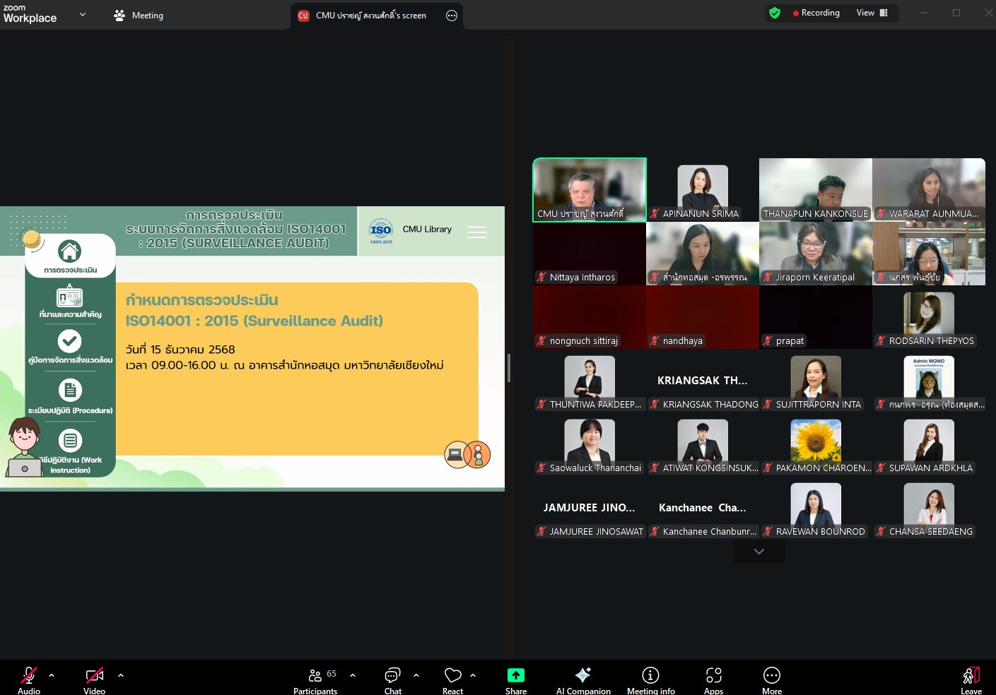 นายปราชญ์ สงวนศักดิ์ ผู้อำนวยการสำนักหอสมุด กล่าวเปิดกิจกรรม Library Green Talk 2568 เพื่อเตรียมความพร้อมให้บุคลากรสำนักหอสมุด สำหรับการ Surveillance Audit ระบบมาตรฐานการจัดการสิ่งแวดล้อม ISO 14001 : 2015 ได้แก่ ประเด็นสำคัญในการเตรียมความพร้อม มาตรการด้านสิ่งแวดล้อมที่ปรับปรุงใหม่ และการดำเนินการของแต่ละ P / WI ในปี พ.ศ. ผ่านโปรแกรมออนไลน์ Zoom เมื่อวันที่ 3 พฤศจิกายน