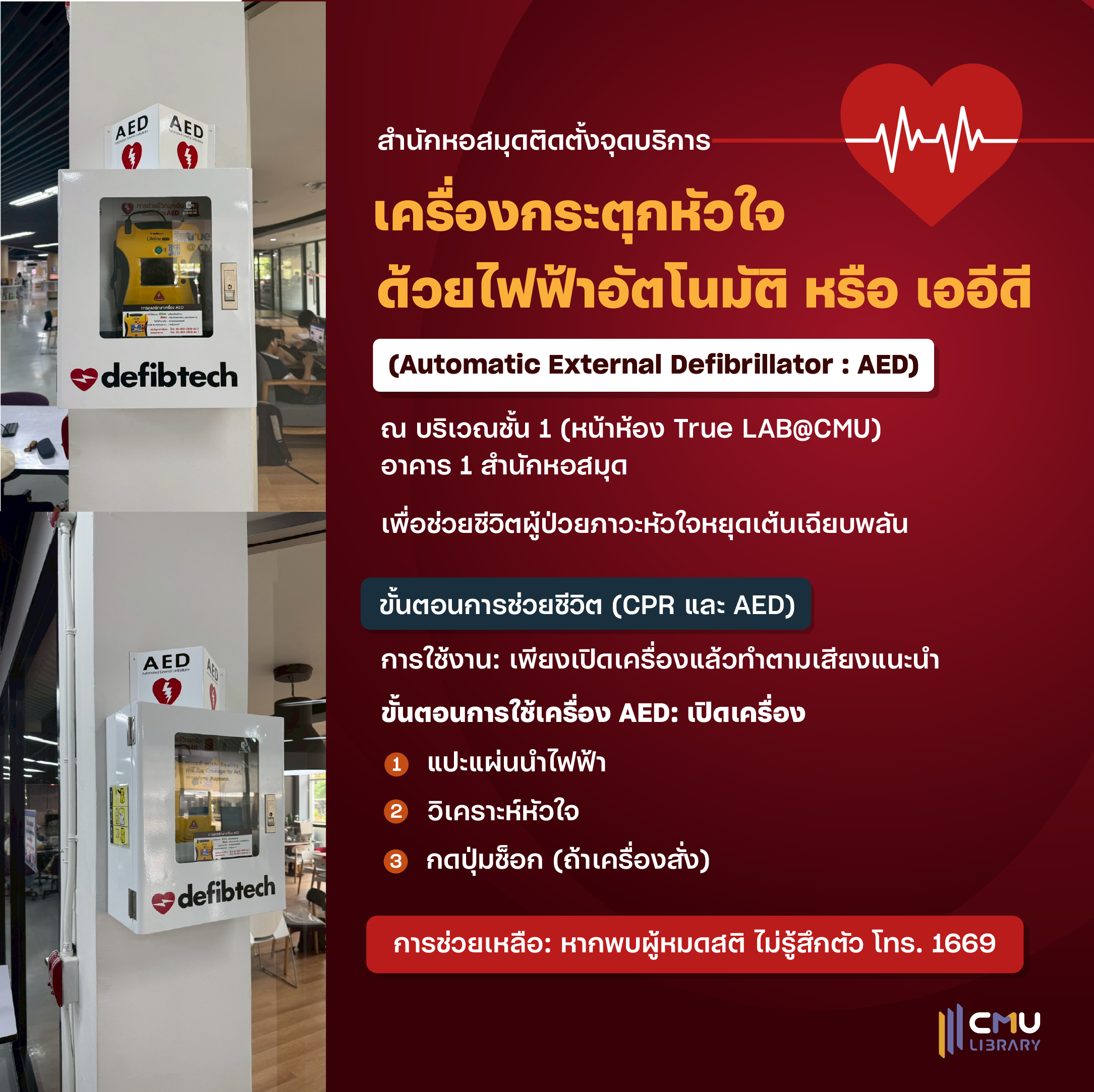 สำนักหอสมุดติดตั้งจุดบริการเครื่องกระตุกหัวใจด้วยไฟฟ้าอัตโนมัติ หรือ เออีดี (Automatic External Defibrillator : AED) ณ บริเวณชั้น 1 อาคาร (หน้าห้อง True LAB@CMU) สำนักหอสมุด เพื่อช่วยชีวิตผู้ป่วยภาวะหัวใจหยุดเต้นเฉียบพลันขั้นตอนการช่วยชีวิต (CPR และ การใช้งาน: เพียงเปิดเครื่องแล้วทำตามเสียงแนะนำ ขั้นตอนการใช้เครื่อง AED: เปิดเครื่อง > แปะแผ่นนำไฟฟ้า วิเคราะห์หัวใจ กดปุ่มช็อก (ถ้าเครื่องสั่ง)...